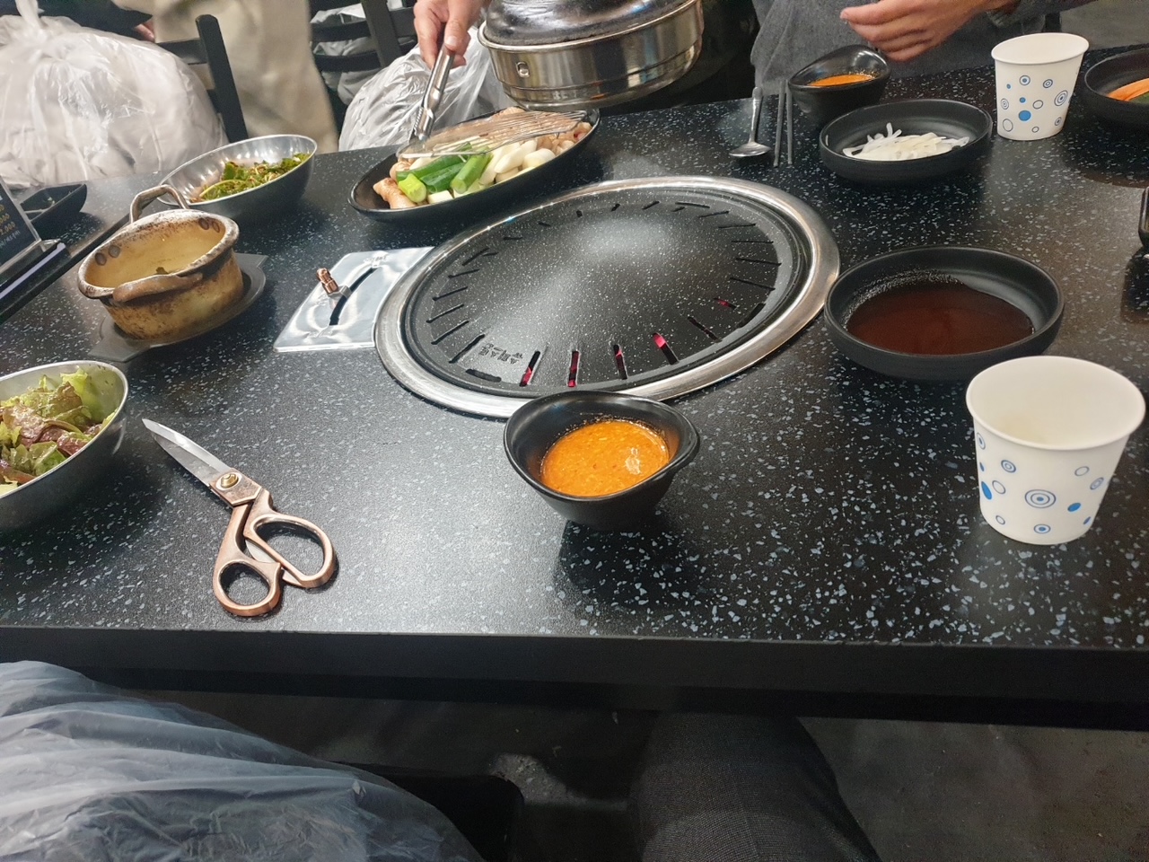 기본찬들입니다. 야채는 셀프바에서 리필 가능합니다. 청경채, 배추, 상추, 깻잎 등 다양한 쌈야채를 비롯해서 당근, 오이, 마늘 뿐만 아니라 구워먹을 수 있는 대파와 떡도 있어서 넉넉히 가져다 드실 수 있습니다. 다양한 소스들도 준비되어 있습니다.