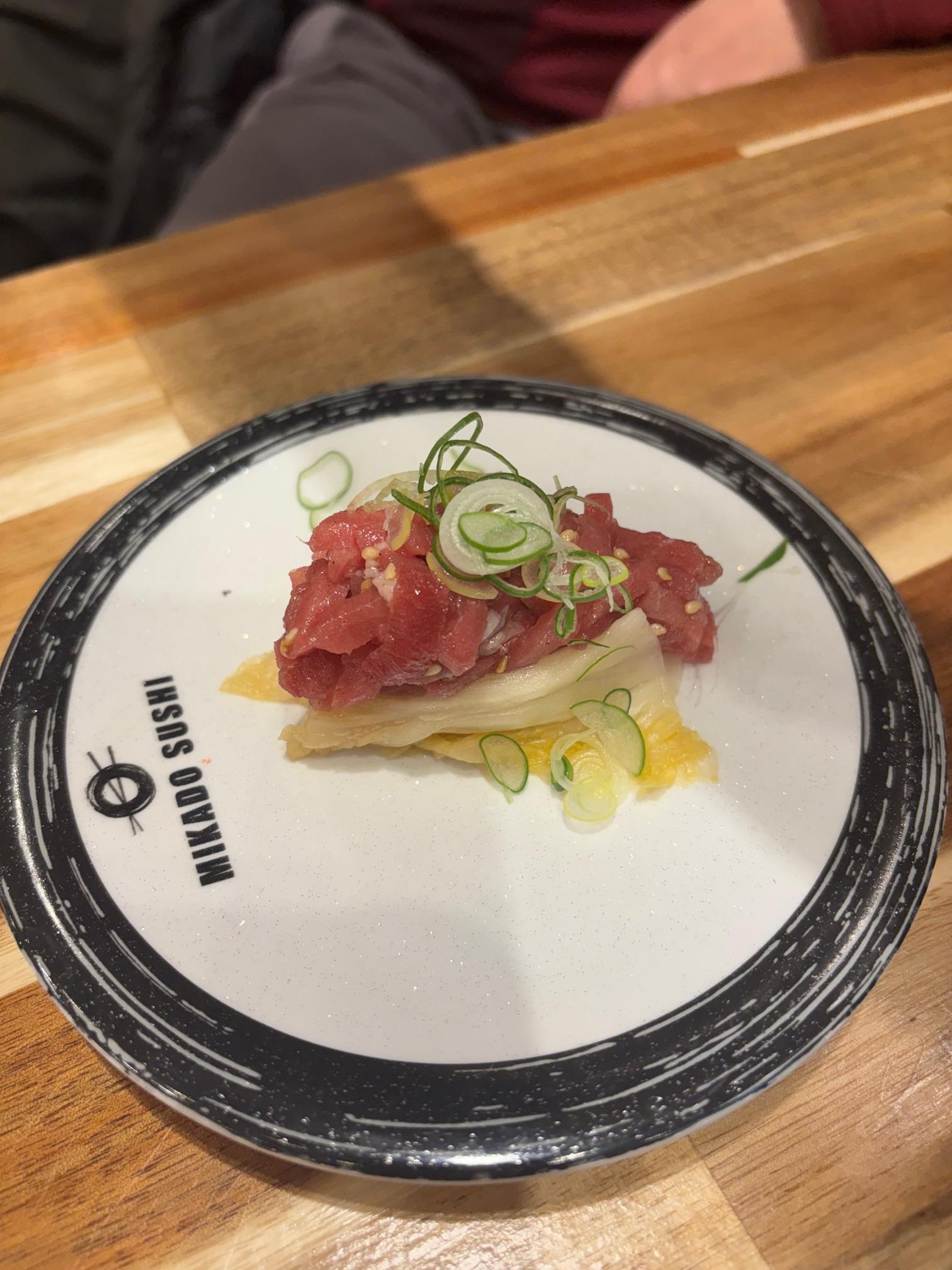 참다랑어뱃살은 무난무난~ 양념새우는 매콤한 소스를 발라서 느끼하거나 물릴 때 먹으면 좋겠더라구요~ 그리고 육회묵은지군함! 이 날 먹은 초밥 중 전 제일 맛있게 먹은 초밥이었습니다. 육회의 시원함과 묵은지의 새콤함이 어우러지는 맛이었습니다. 사람들 입맛은 비슷하다고 했던가요~ 요 초밥이 인기메뉴인지 레일에 올라오면 앞에서 다들 가져가시더라구요.. ㅠㅠ 그냥 주문해서 바로 받으시는 것이 빠를 듯 합니다.