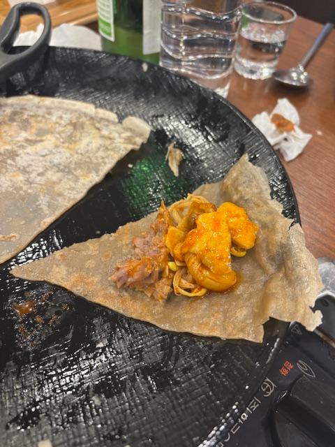 세트 구성 중 하나인 메밀전은 거진 빛의 속도로 기본 반찬 세팅 시 함께 제공되는 수준으로 빨리 나옵니다. 요 메밀전이 또 별미거든요~ 간장에 찍어 먹어도 맛있지만 등갈비를 싸 먹으면 그 맛이 배가 됩니다. 저흰 메밀전 하나론 부족해서 항상 메밀전을 또 한장 추가해서 먹어요~ ㅋㅋㅋ