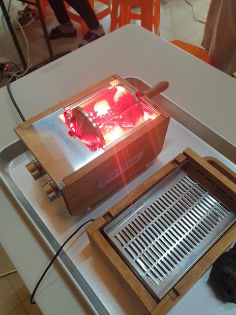 여러 가지 커피 기구들에 대해 설명도 듣고, 말린 커피콩 냄새도 맡아보고, 로스팅되는 과정도 쭉 지켜봅니다. 말린 생두와 볶은 커피콩은 색깔과 크기가 확연히 다르네요!