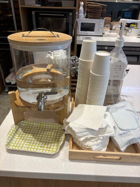 카운터 옆에 생수와 휴지가 비치되어 있습니다. 전 기본 소금빵 1개와 휘낭시에 남아 있는 것 전 종류 한개씩, 그리고 커피의 기본인 아메리카노를 주문했습니다.