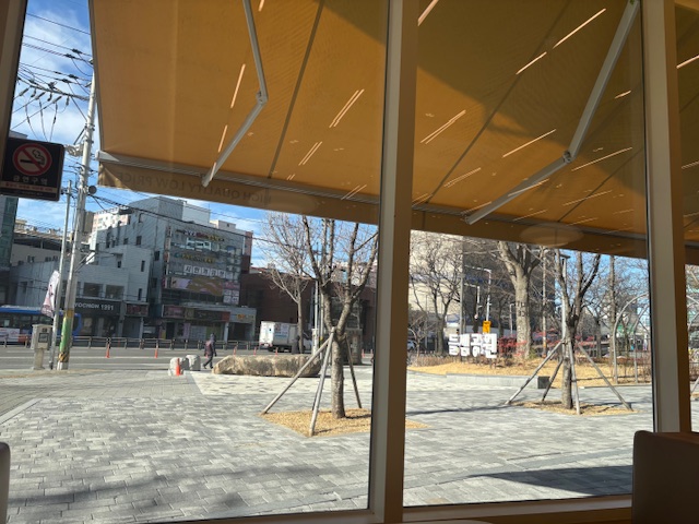 매장 입구 기준 왼쪽으로는 다인석 테이블이 있습니다. 이 곳은 통창유리로 되어 있어요~