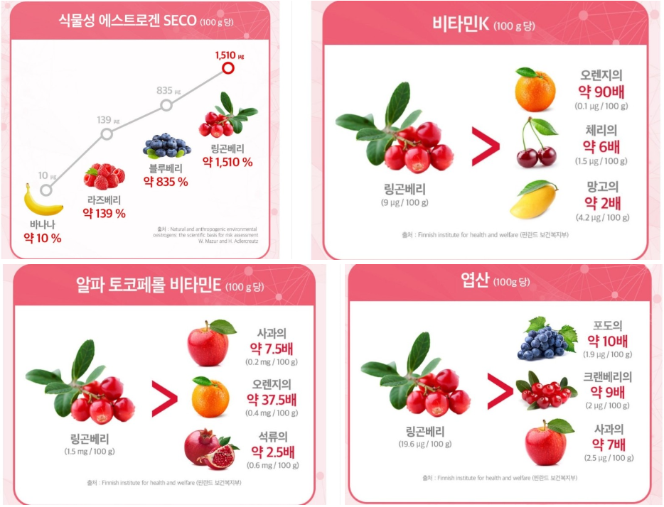 링곤베리 성분 중 천연 에스트로겐이라고 불리는 리그난 성분은 체내 에스트로겐과 유사한 구조로 되어있으며 부족해진 호르몬을 보충해 갱년기 증상 완화에도 좋다고 알려져 있습니다.