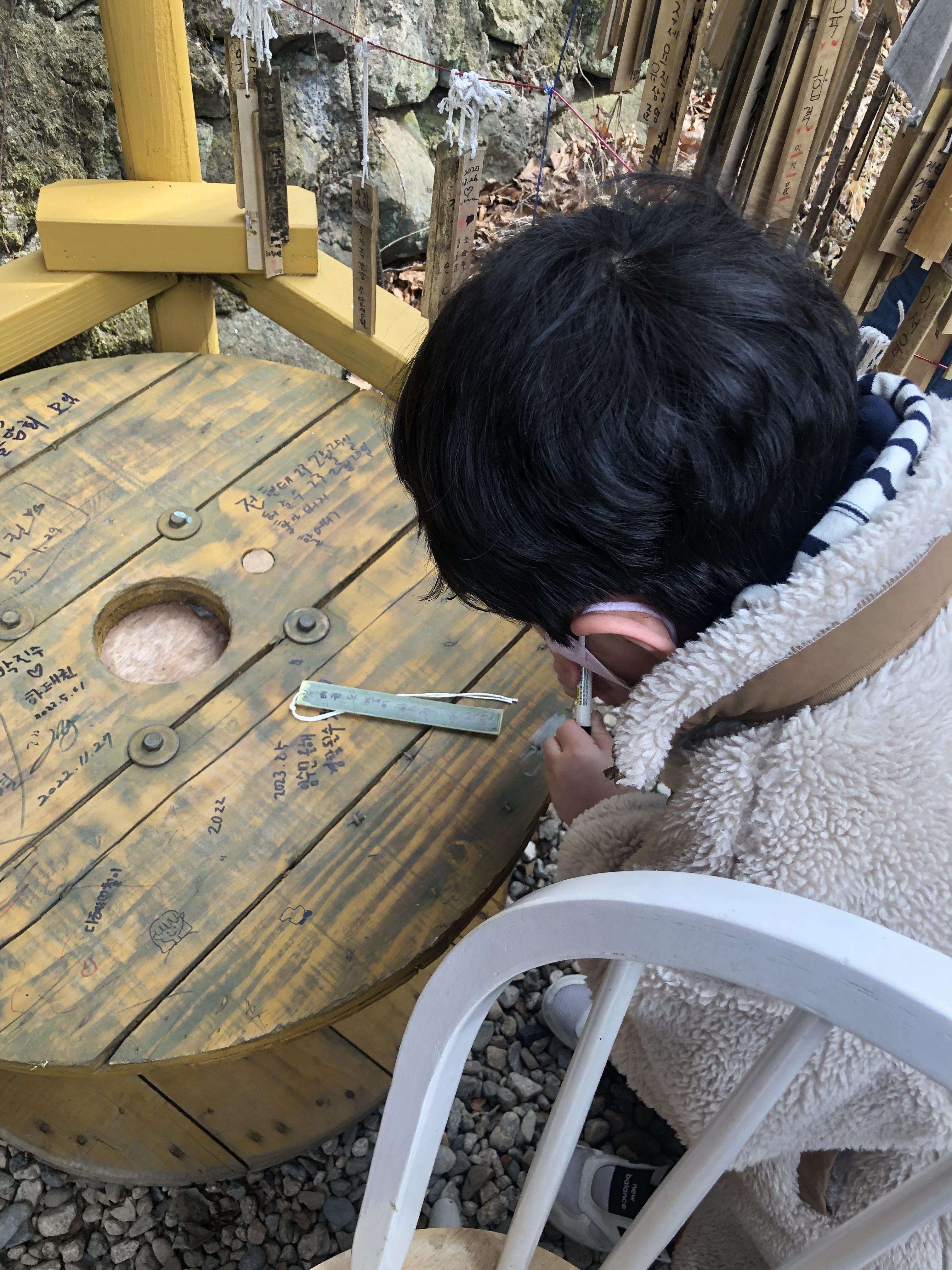 특별한 것은 없고... 장승구경과 함께 소원적기 코너가 있습니다. 가격은 1000원이며, 무인시스템으로 돈 넣고 나무 조각에 소원을 적어 걸어두면 됩니다. 특별하진 않지만 아이가 좋아하네요~