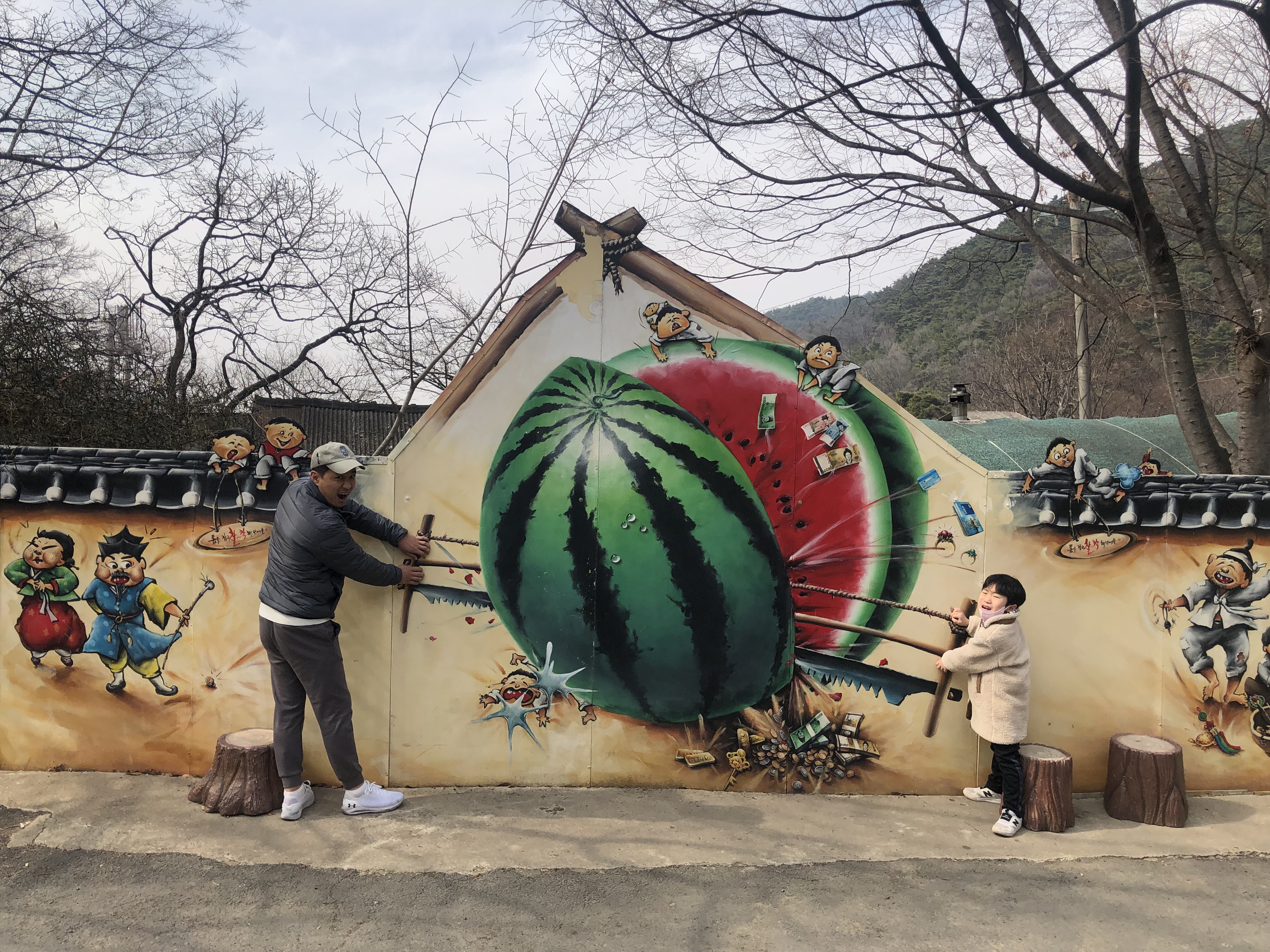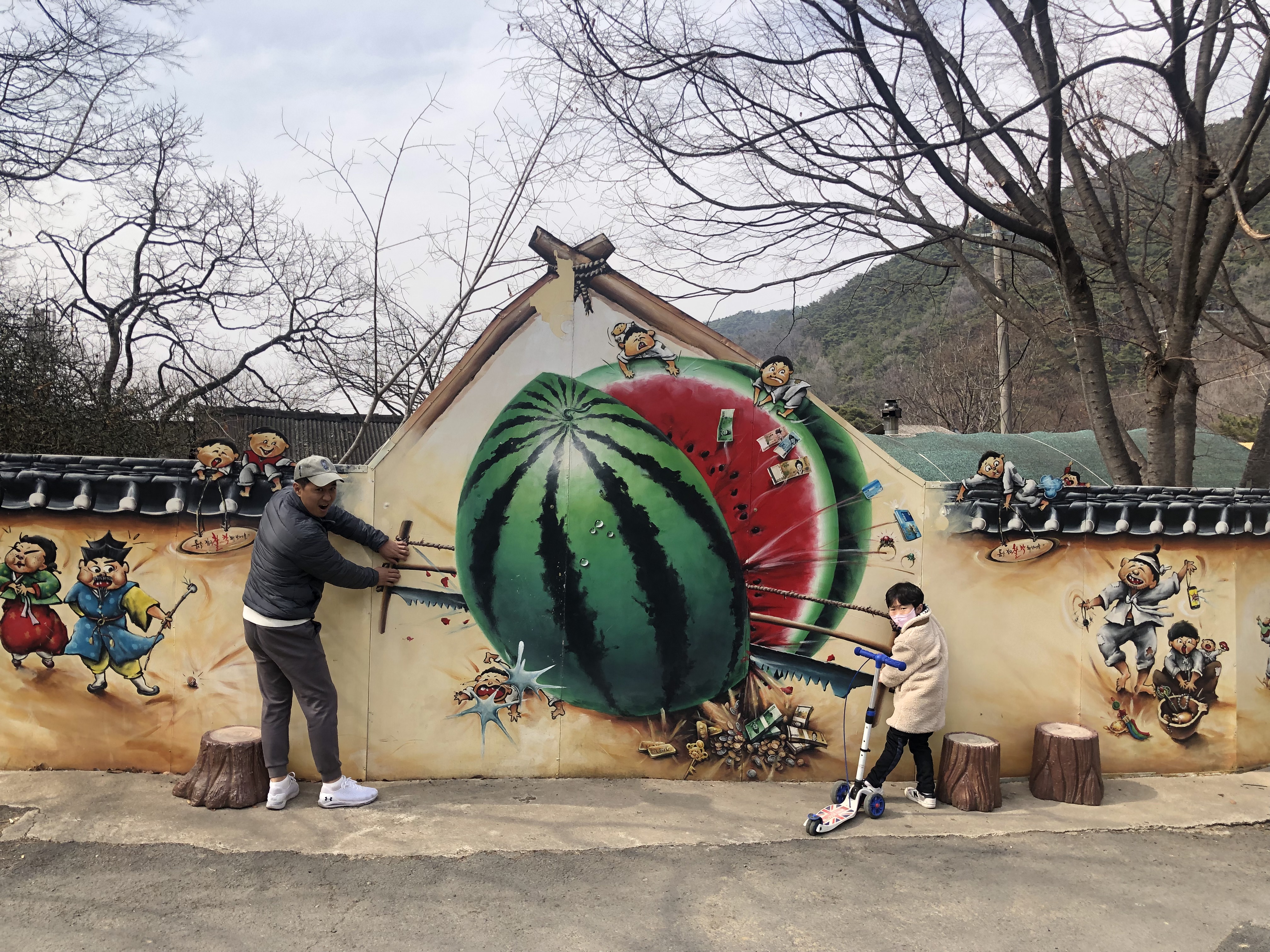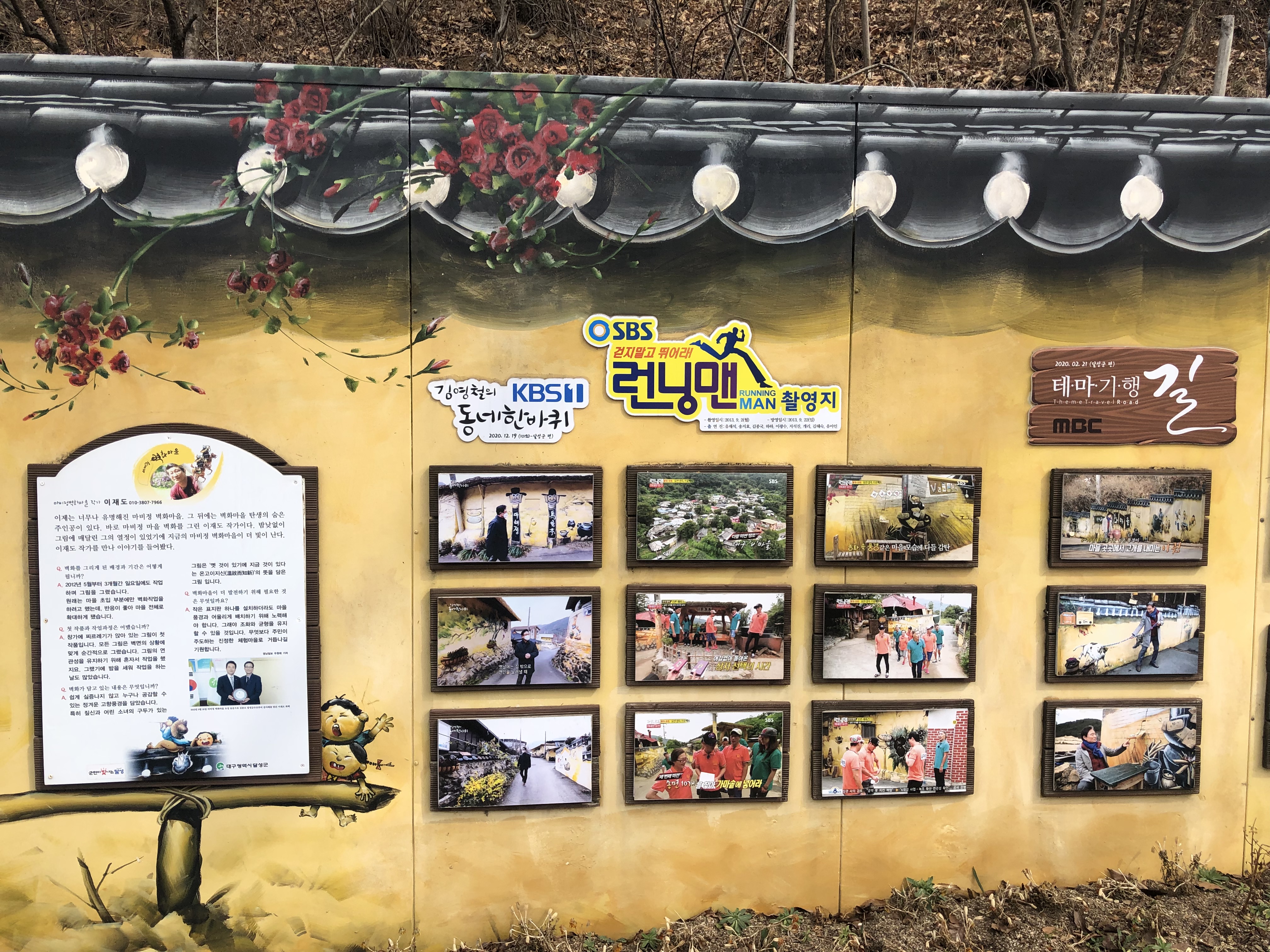 60년대 농촌풍경부터 80년 새마을 풍경, 90년대 배경까지 벽화로 꾸며져 있는 마을 길을 따라가다 보면 연리목, 물레방아, 옛 우물, 거북바위과 남근 바위 등의 볼거리가 있는 산골 마을입니다. 실제 주민들이 거주하는 곳이기도 하구요~
