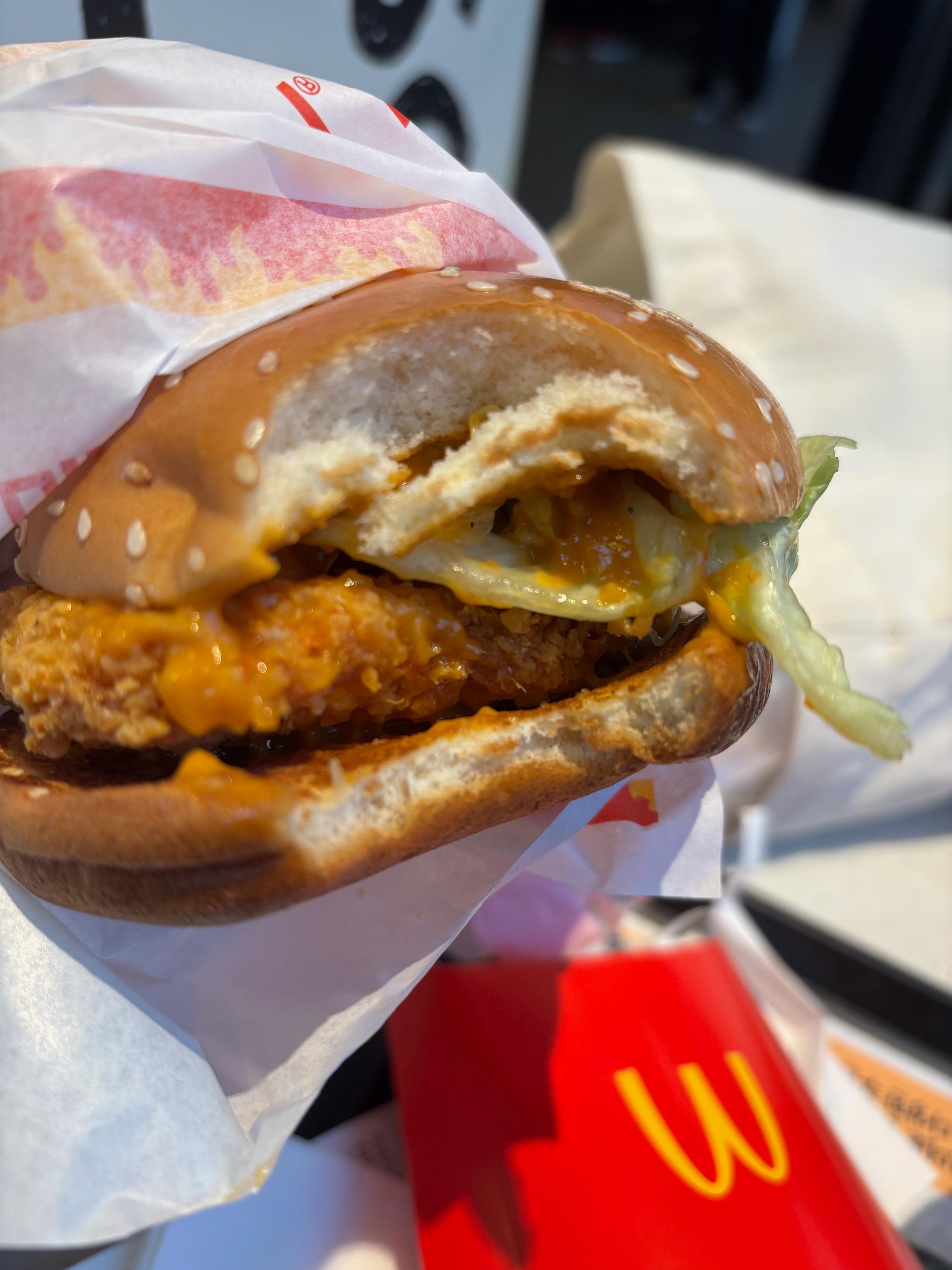 치킨패티가 어째 해가 갈수록 얇고 작아지는 것 같은 건 저만의 느낌인가요... ㅎ 광고에선 소스 색이 연한 살구색으로 보이는데, 실제론 주황색에 가까웠어요~
