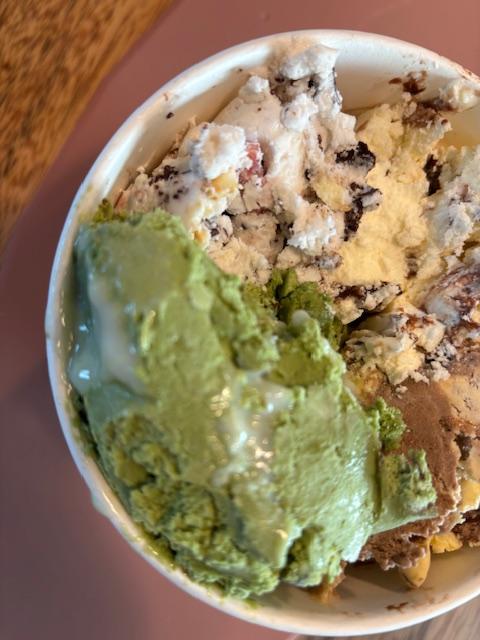 암튼.. 깊고 진한 제주산 말차 아이스크림에 팥과 연유를 둘러 쌉쌀하면서 달콤한 맛조합을 이루게 개발했다고 합니다. 사진에 연유 같은 흰 시럽이 보이시죵? 여기에 쫀득한 녹차 떡 다이스를 쏙 넣어 식감의 재미까지 더했습니다.