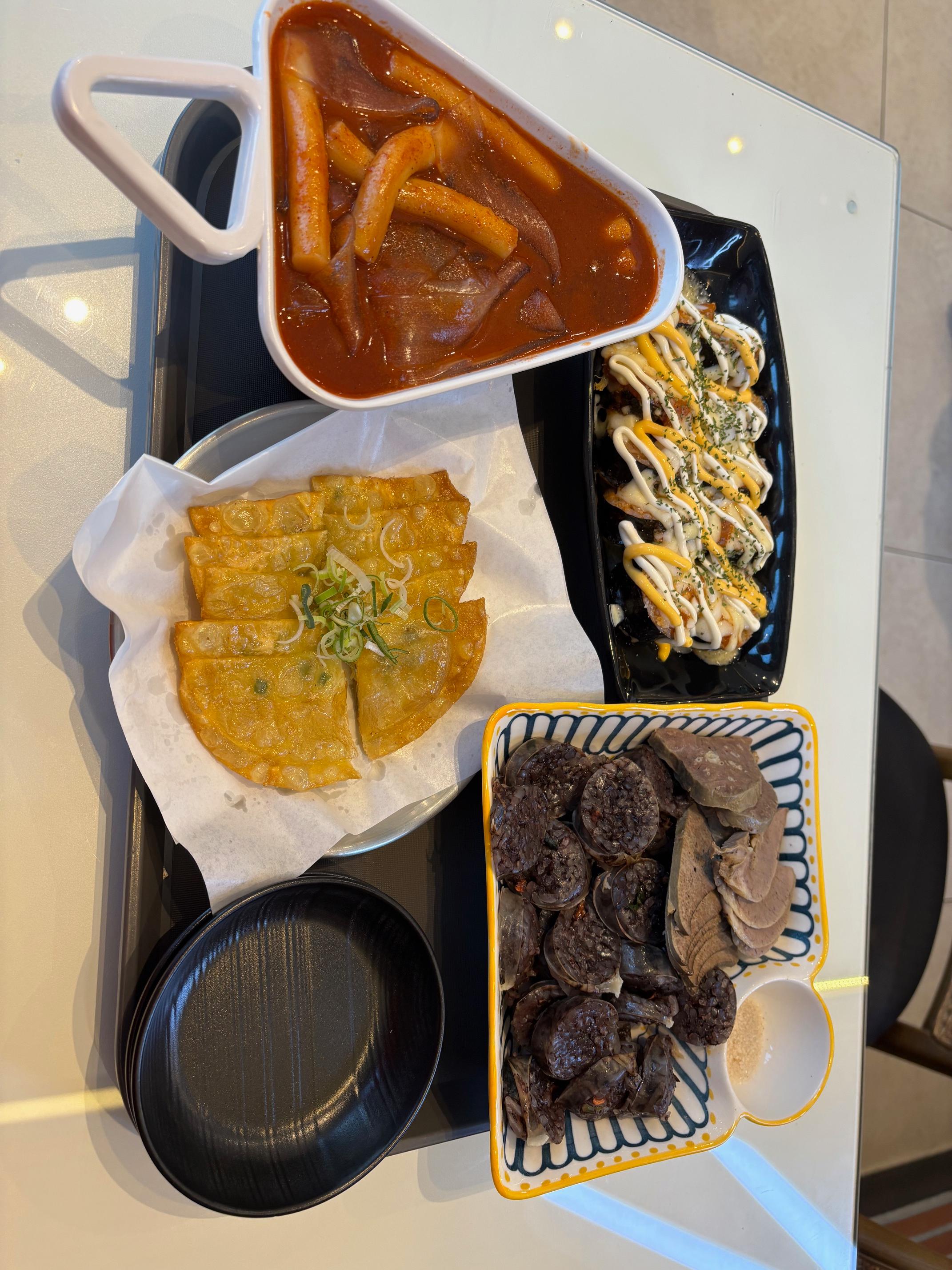 주문한 음식은 엄청 빨리 나옵니다. 거의 패스트푸드 수준~~ 저흰 떡볶이에 중국당면을 추가했는데, 부들부들하고 쫀득했습니다. 그리고 유명한 신전김밥! 치즈신전김밥을 주문했는데 뜨겁고 맵고~ 처음 한두개는 너무나 맛있게 먹었는데 위에 뿌려진 소스 때문인지 점점 느끼해지더라구요..ㅠㅠ 순대는 그냥저냥 평범한 맛이었습니다.