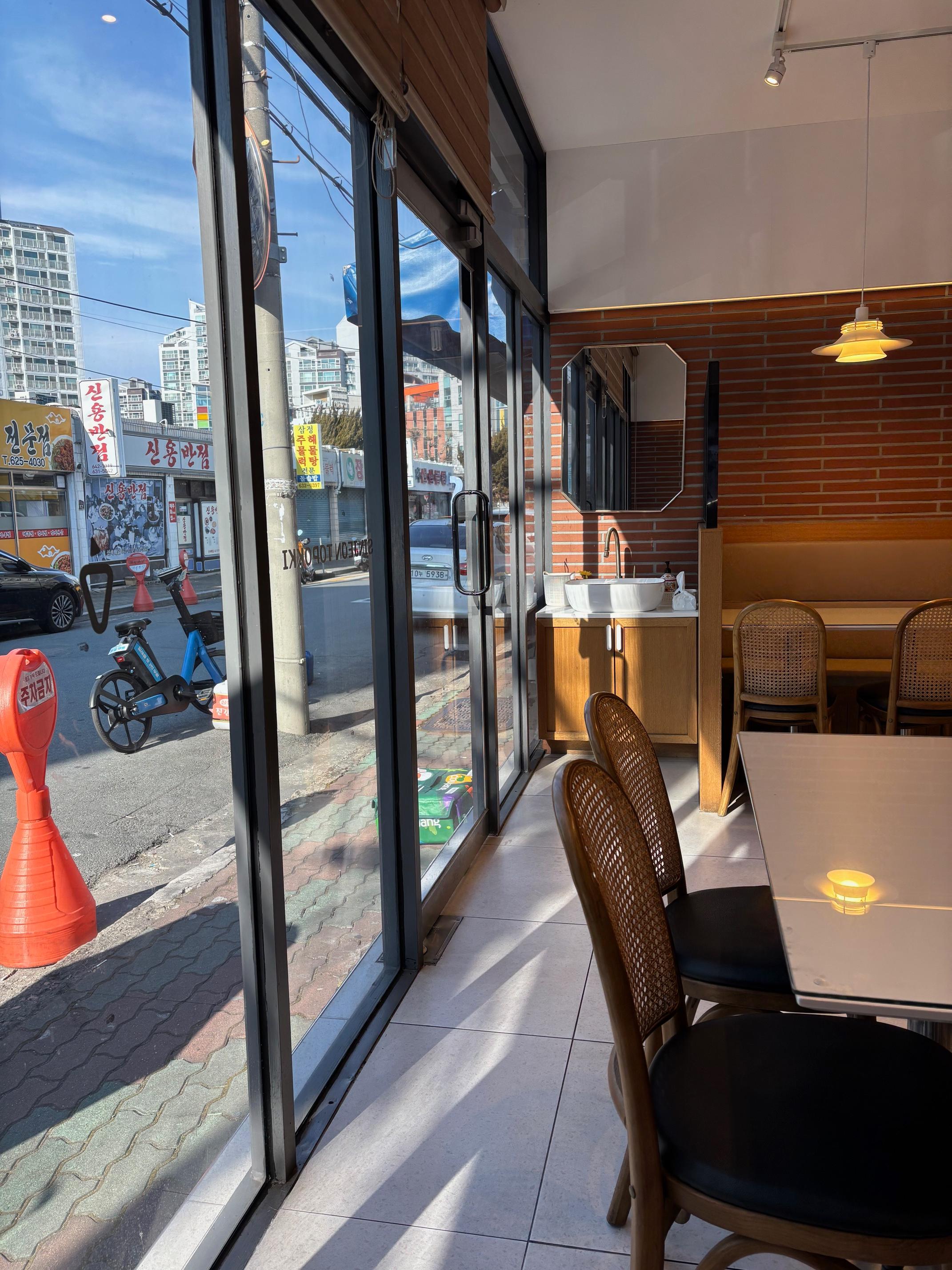 가게 외부모습이 워낙 짙게 썬팅되어 있어 영업여부가 잘 보이지 않지만 안으로 들어서면 깔끔한 매장모습이 드러납니다. 테이블은 총 4개로 내부가 작지만, 깔끔하고 테이블 간격도 넓은 편이었습니다. 정면으로는 주문할 수 있는 키오스크가 있고, 그 옆으로는 수저, 정수기, 휴지 등이 있는 셀프바가 있어요. 그리고 가게 한켠에 손을 씻을 수 있는 세면대가 있습니다.