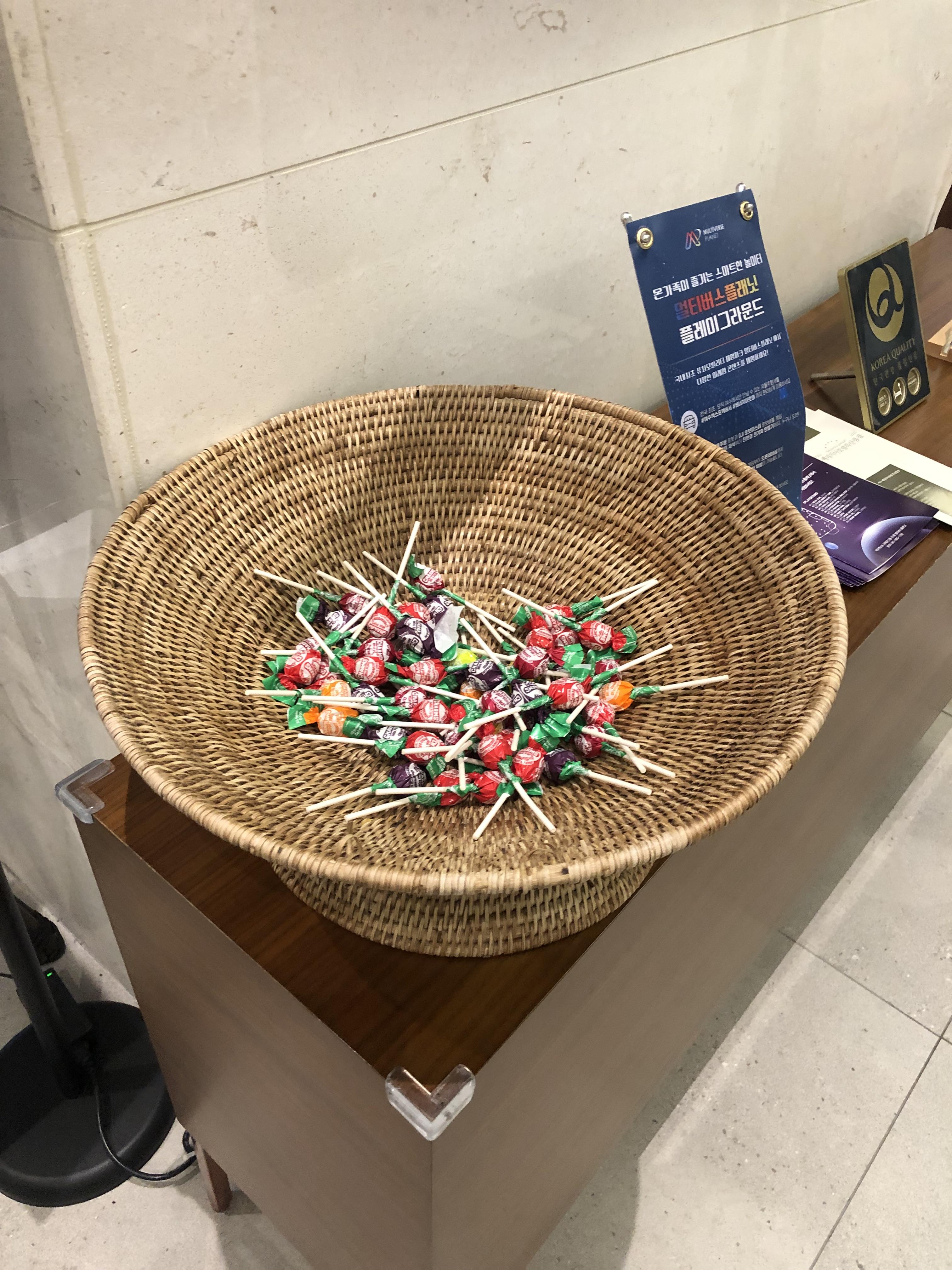 로비가 그닥 크지는 않습니다. 로비 중앙에는 포근한 소파들이 위치해 있습니다. 체크인 시작 시간(15시) 즈음에는 많은 사람들로 붐벼 대기번호표를 뽑으셔야 합니다. 번호표 기계 옆에 웰컴캔디도 있으니 자유롭게 가져가셔서 드시면 됩니다.