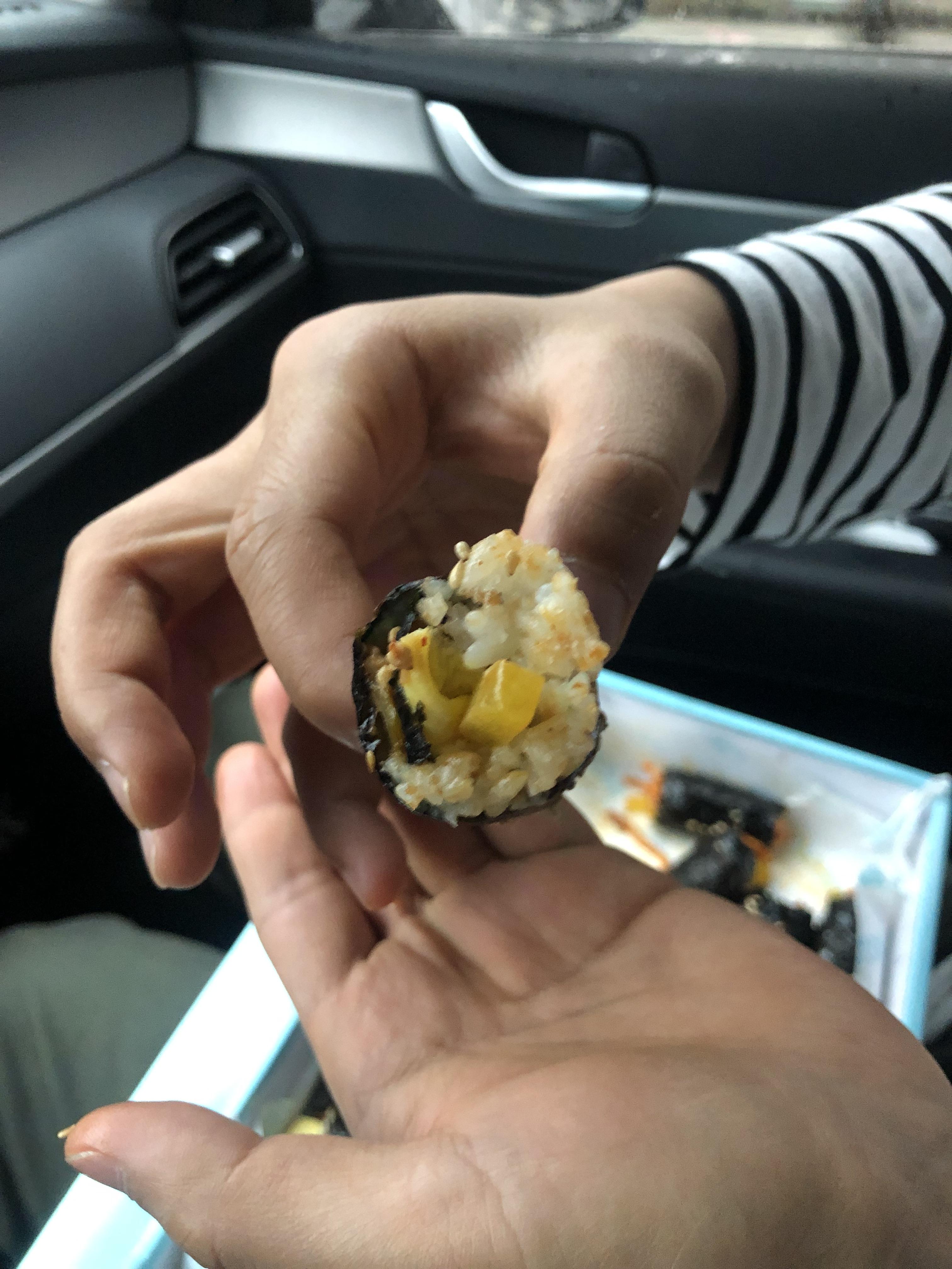 대참사가 일어났습니다... 신랑에게 받아오라고 시켰더니 가로로 들고 와야하는 김밥상자를 사진처럼 세로로 들고오는 바람에 김밥들이 이리저리 뒹굴고 엉망진창이 되어버렸습니다. ㅠㅠ (사람이 너무 많고 정신이 없어서 도망치는 그냥 들고나왔다고 하네요..)