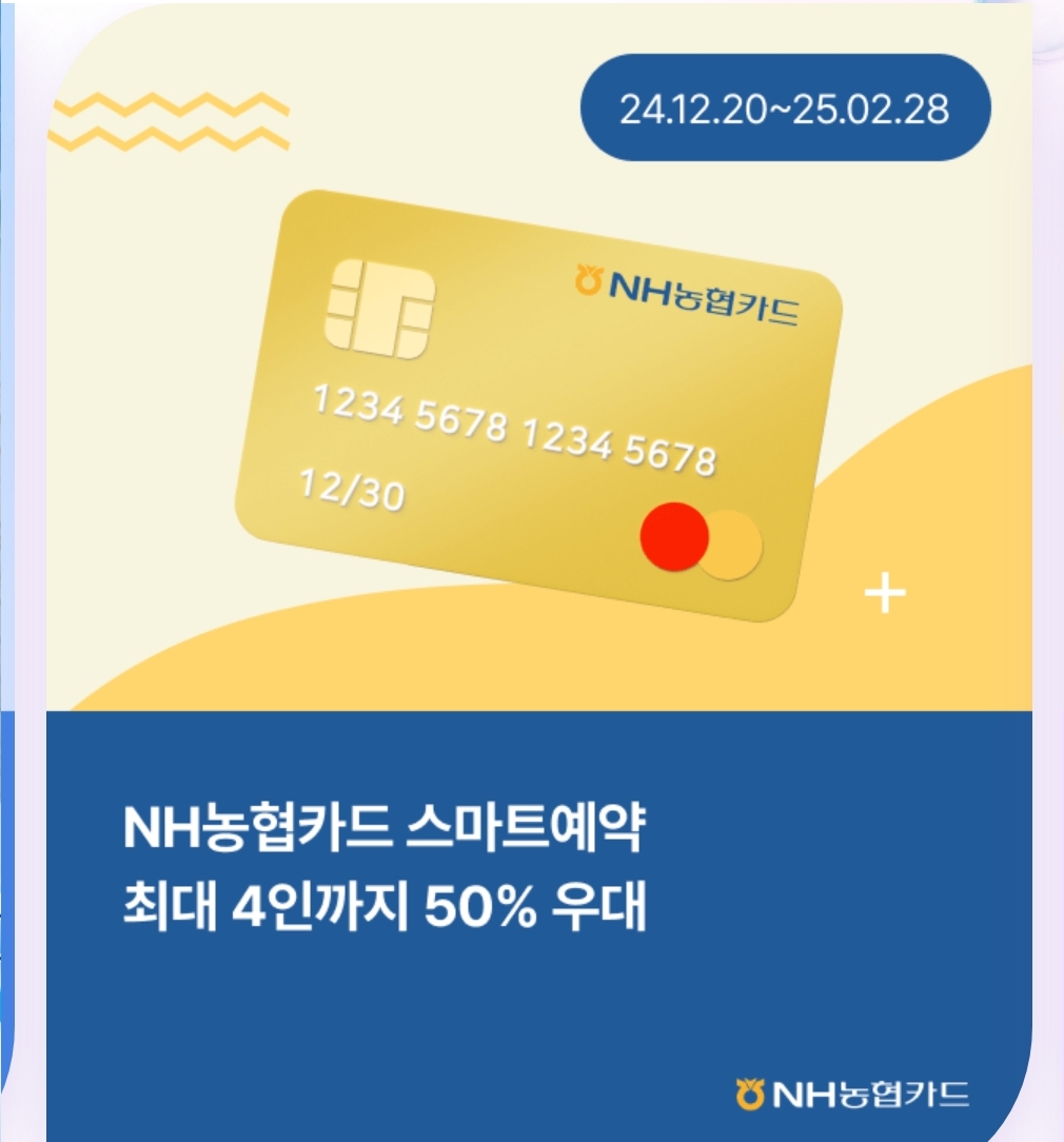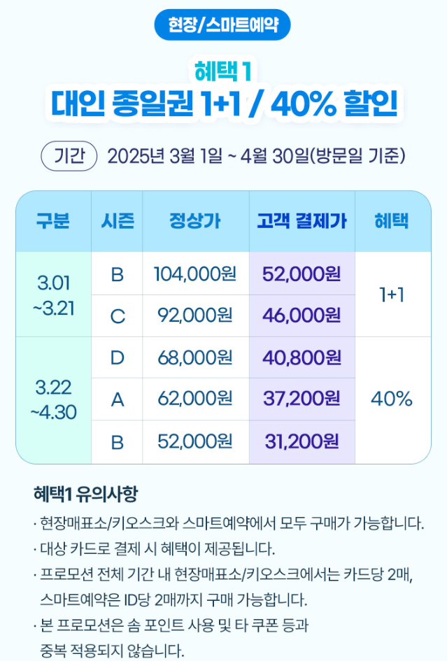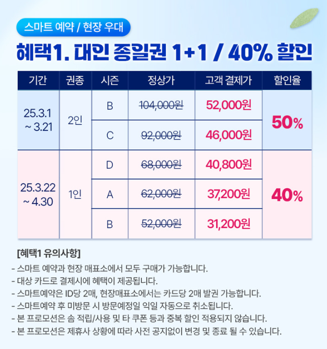 농협카드(체크카드 포함)를 소지하고 계신 분이라면 1+1 혜택(실제 1인 기준 50% 할인)을 받을 수 있습니다. 스마트 예약 또는 현장 할인 모두 가능합니다. 그래서 전 요거 이용해서 또 구매했습니당~ ㅎㅎ