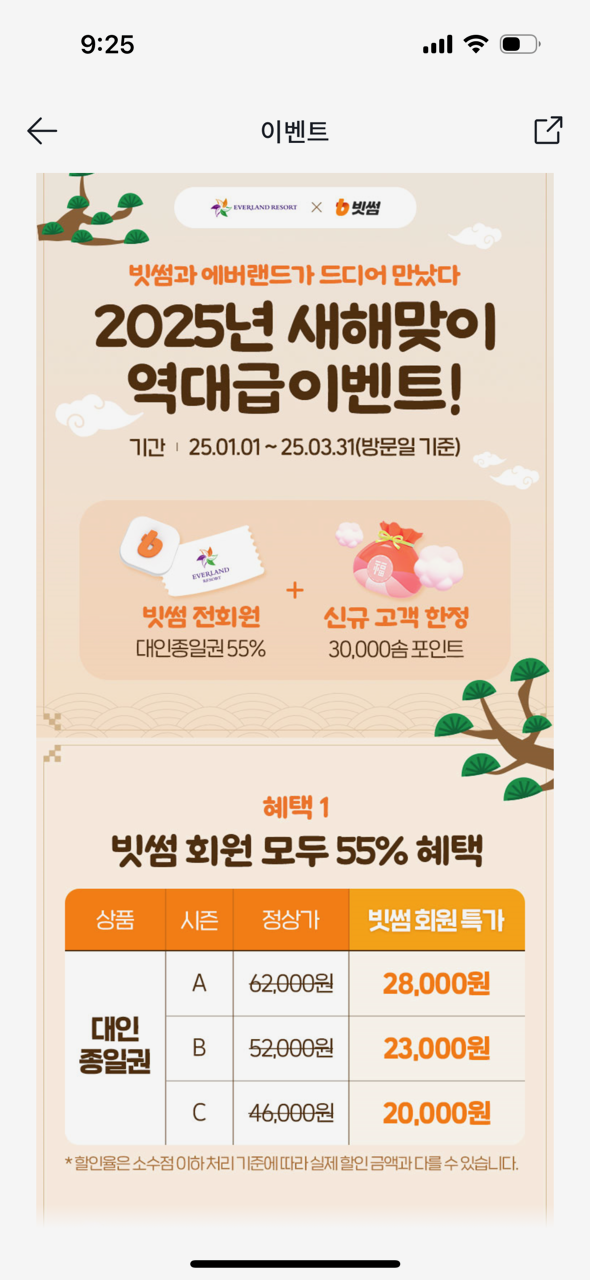 앱에 들어가시면 다양한 제휴혜택과 이벤트들을 볼 수 있습니다. 그 중 본인에게 가장 적합한 것을 선택하셔서 입장권을 구매하시면 됩니다. 소셜에서 구매하는 것보다 제일 저렴하게 구매할 수 있는 방법입니다.