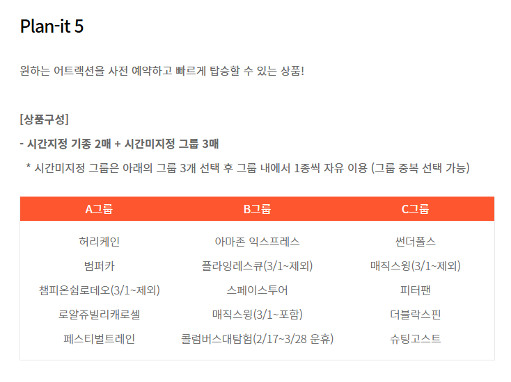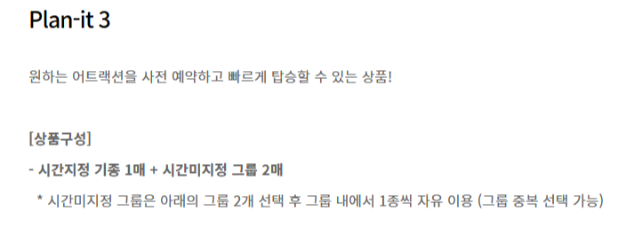3. 입장권+플랜잇3 or 5 : 놀이시설 3개(혹은 5개)에 한해 대기 없이 바로 놀이시설 이용 가능