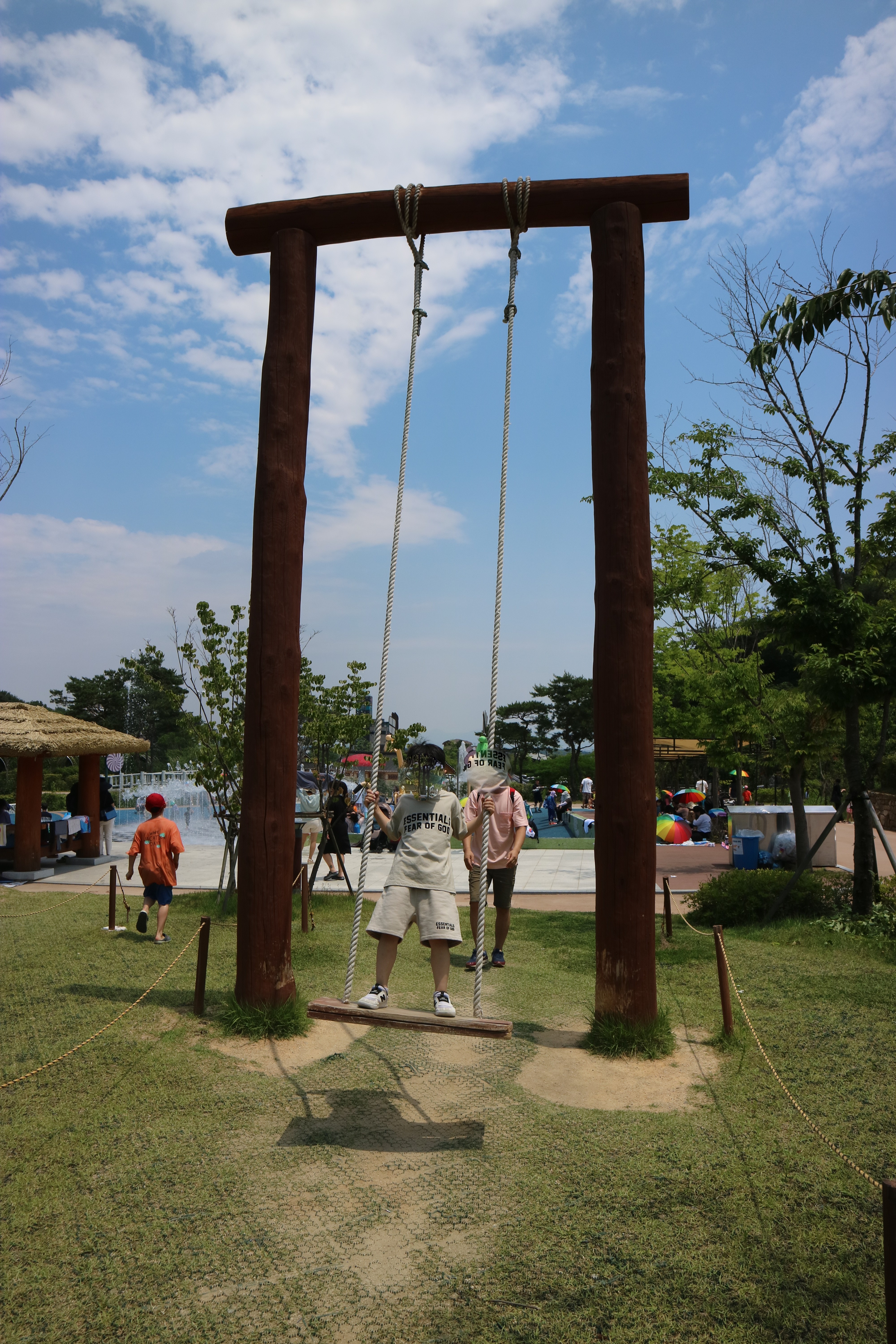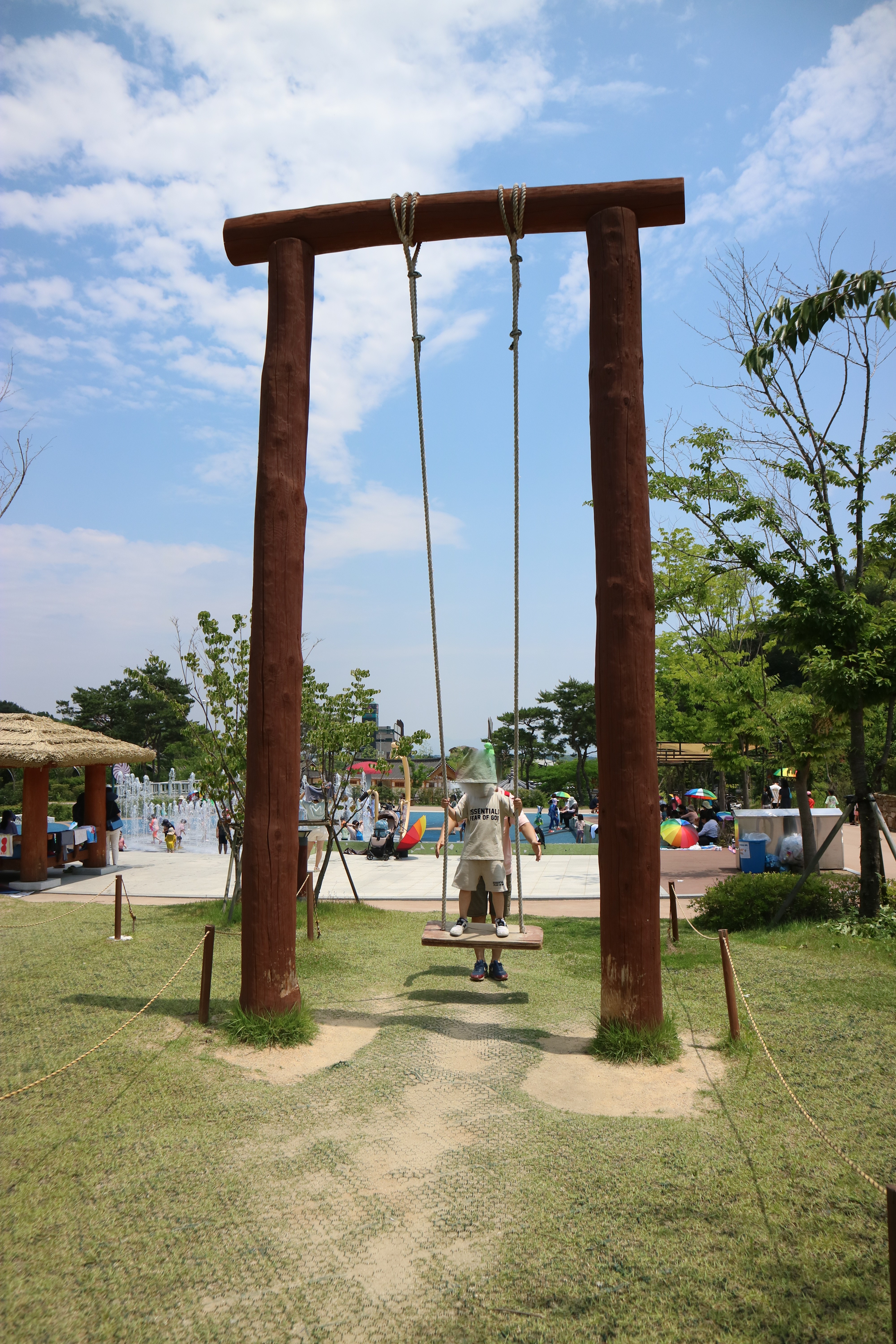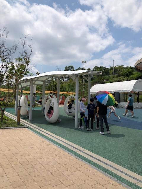 그네 뒤로 물놀이터가 보이시죠? 날이 더워서 그런지 물놀이터에서 놀고 있는 아이들이 굉장히 많았습니다. 여기 주변에 사시는 주민들이 가족단위로 음식을 준비해 오셔서 아이들은 신나게 물놀이를 하고 어른들은 데크에서 휴식을 취하는 분들이 굉장히 많았습니다.