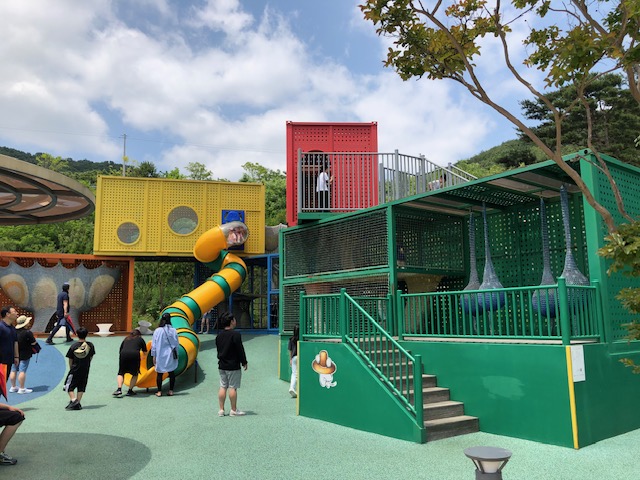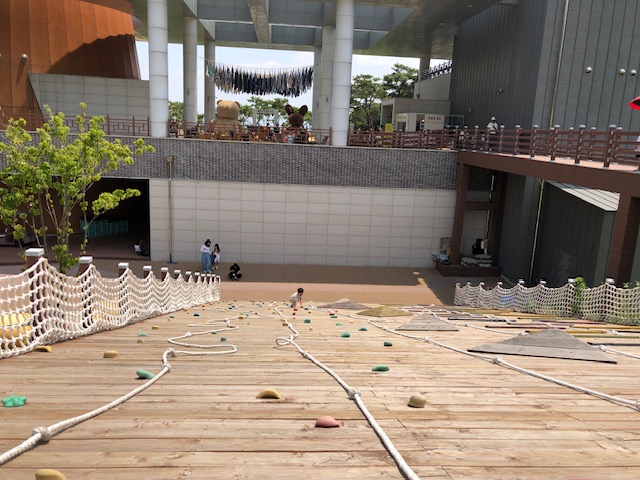 다시 슬라이드 존에서 조금만 내려오면 오른족으로 4D를 감상할 수 있는 메인건물과 긴 미끄럼틀, 컽네이너 놀이터, 승마체험장이 나옵니다. 클라이밍 할 수 있도록 되어있는 곳은 사진에는 경사가 좀 있게 나왔지만 실제로는 그리 경사가 가파르지 않아 로프를 잡지 않고도 올라올 수 있습니다.