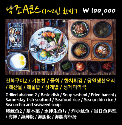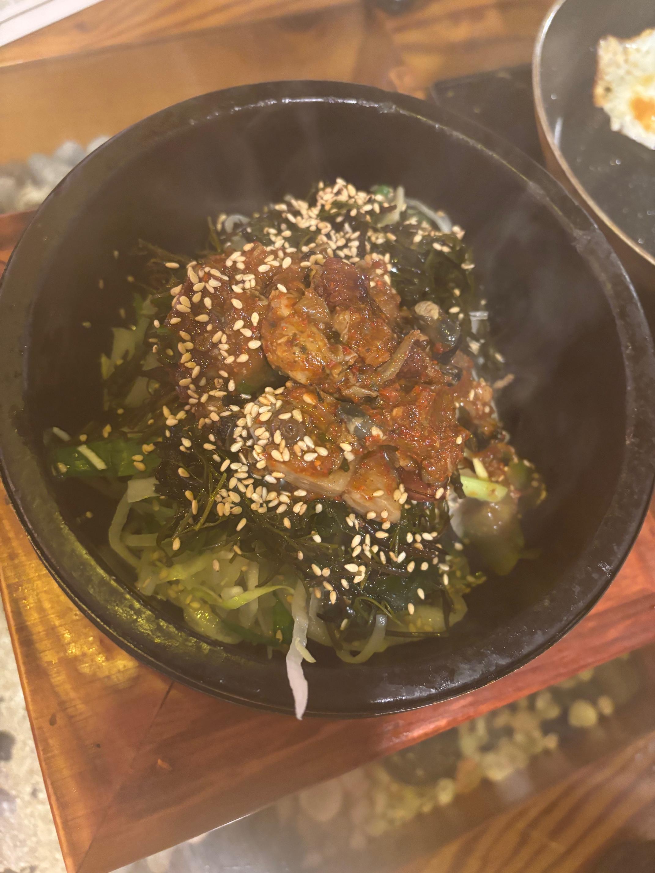 몸, 톳, 미역 등 해초와 성게, 전복, 소라 등에 숙성 간을 한 해물 소스가 같이 나와 비벼 먹는 밥입니다. 돌솥에 나와서 끝까지 뜨겁게 먹을 수 있어서 너무 좋았어요! 다양한 해물을 같이 먹을 수 있어서 좋았고, 누룽지가 생기면 바싹한 식감을 느낄 수 있어서 재미있었습니다. 다만.. 살짝 짜긴 했어요.. ^^;; 그래도 다른 지역에선 쉽게 접할 수 없는 메뉴이기 때문에 꼭 한번은 드셔보시라고 추천하고 싶습니다.