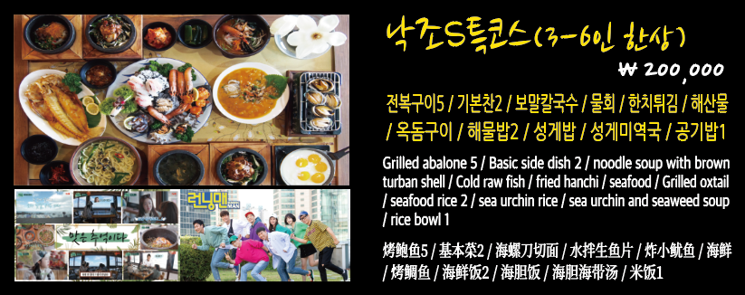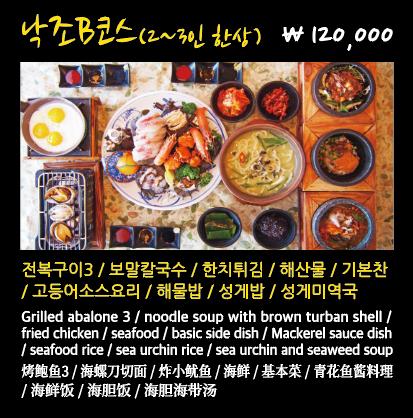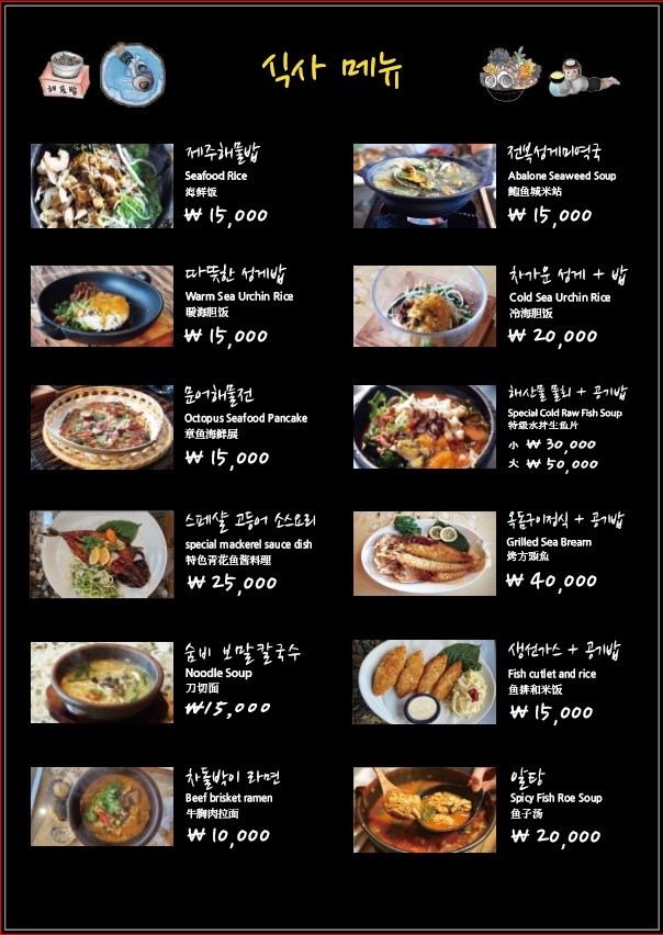 메뉴 확인하시구요~ 단품으로 시키셔도 되고, 세트로 시키셔도 됩니다. 저흰 이 곳을 시그니처 메뉴인 제주해물밥과 전복성게미역국을 주문했습니다.
