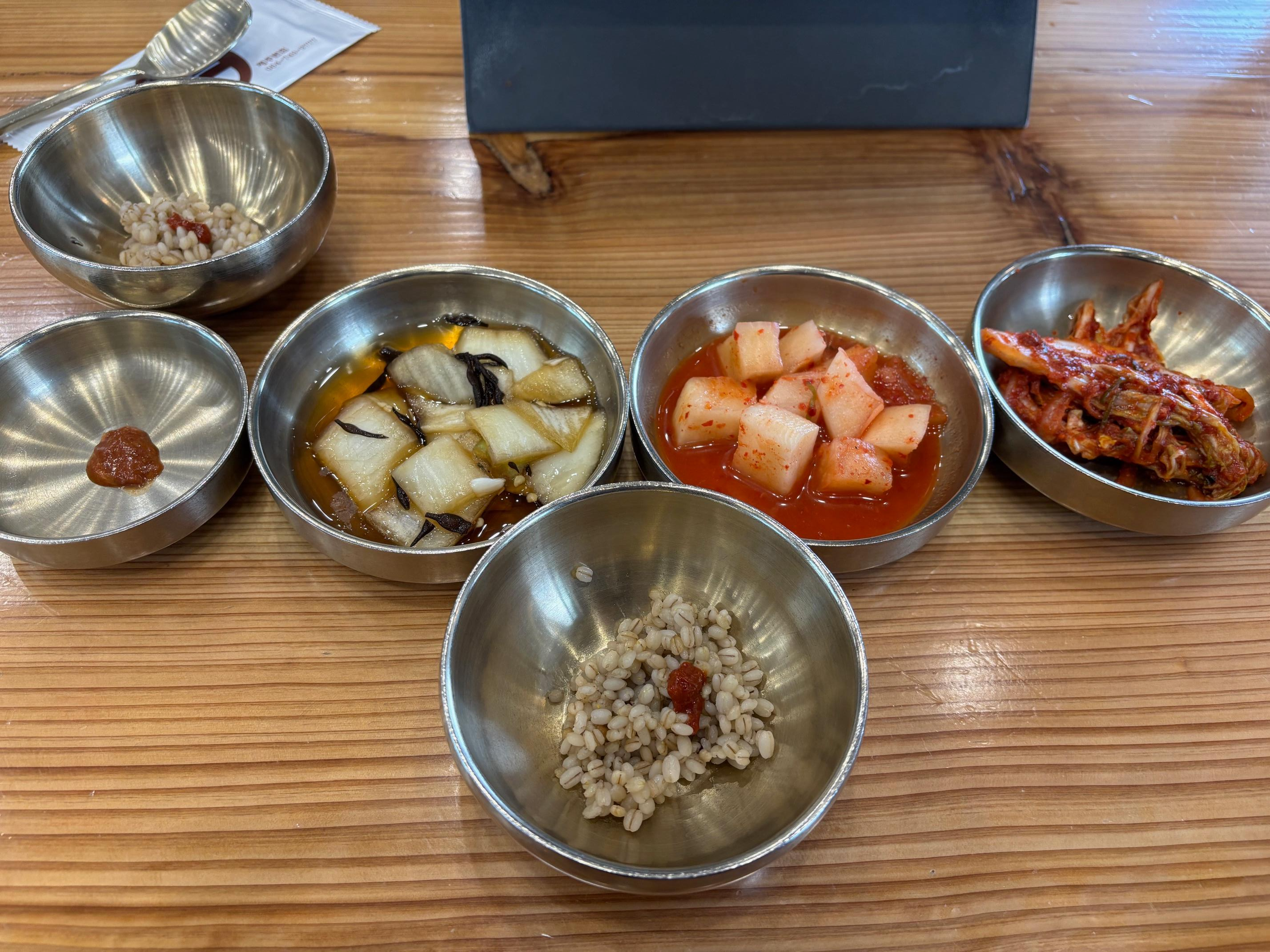 주문은 테이블에 붙은 큐알코드를 찍어 합니다. 큐알이 먹히지 않는 경우가 있는데, 이런 경우 종업원에게 말하면 바로 주문 넣어주십니다. 주문을 하면 바로 밑반찬들을 주시면서 반찬들에 대해 설명해 주십니다. 김치가 맵다고 말씀해주셨는데 아... 정말 맵습니다. 하지만 요것이 자꾸 입맛을 당겨요~ 그리고 전 양파가 너무나 맛있었습니다. 저 혼자 한접시를 다 먹을 정도루요~ ㅠㅠ 보리밥은 진짜 한숟가락 주십니다.(엄마기준 한숟가락 아닙니다.) 한숟가락 밖에 안되는 더 감질맛 나더라구요~ 공기밥 따로 판매하십니다.