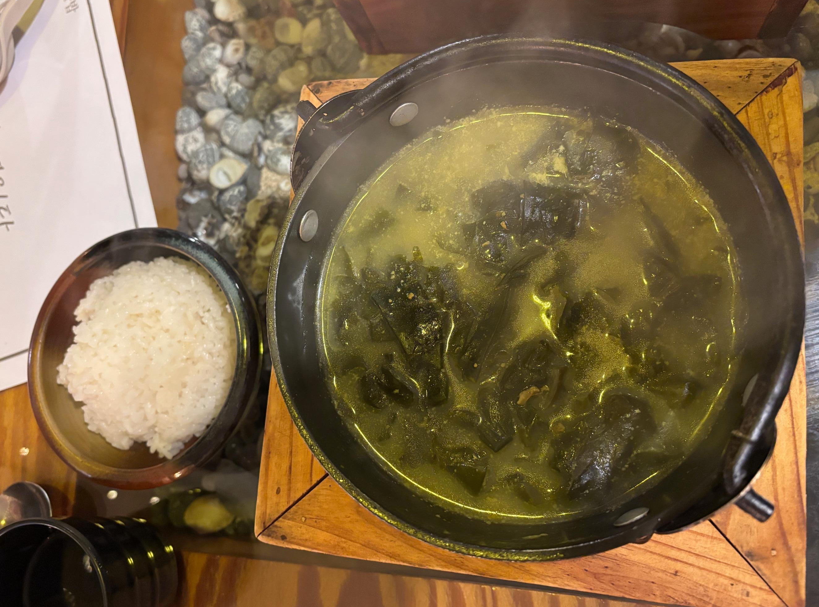 전복성게미역국입니다. 밥이 같이 나옵니다. 근데.... 전복은 듬성듬성 있는게 성게가 절대 보이지 않았습니다. 원래 전복미역국이냐고 물어보고 싶을 정도로... 맛은 진한 미역국이라 맛있었지만 해물밥을 시키면 기본적으로 작은 미역국을 주신다고 하니 굳이 이 돈을 내면서 먹을 필요가 있을까 생각이 들었습니다.