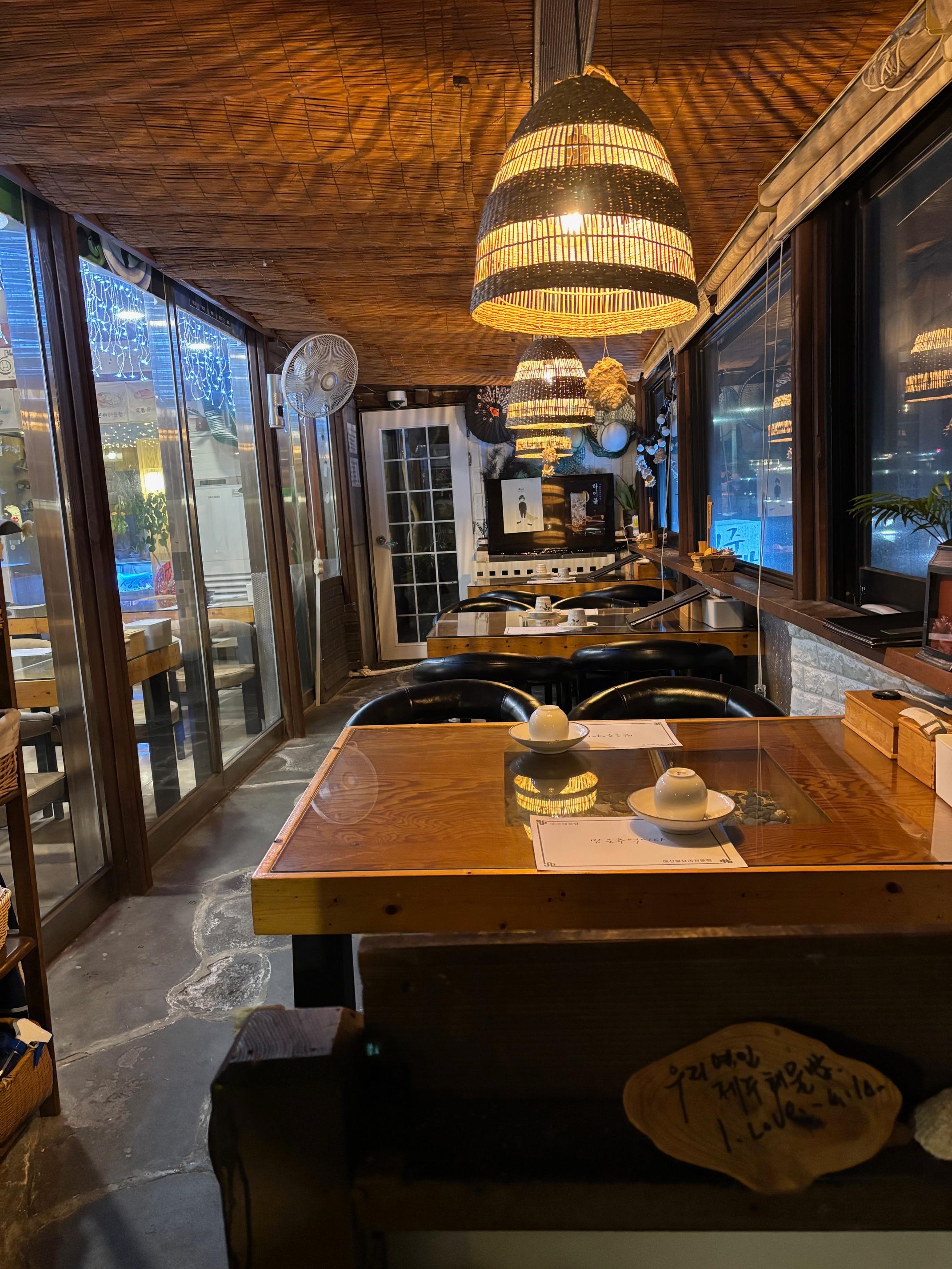 식당을 들어서면 발코니 같은 곳에 좌석이 있는 공간이 나오고, 문을 하나 더 넘어서면 오른쪽에 보이는 본 공간이 나옵니다. 낮엔 발코니 부분에서 바다를 보며 식사를 하면 좋을 듯 해요~