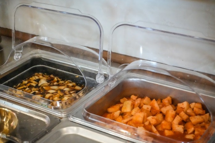 카운터 옆에는 휴대폰 충전선들과 토밥 명패가 진열되어 있네요. 한쪽 벽면에는 사진메뉴판들이 걸려져 있었습니다. 반찬을 리필할 수 있는 셀프코너도 마련되어 있었는데 굉장히 깔끔하게 관리하고 있었습니다.