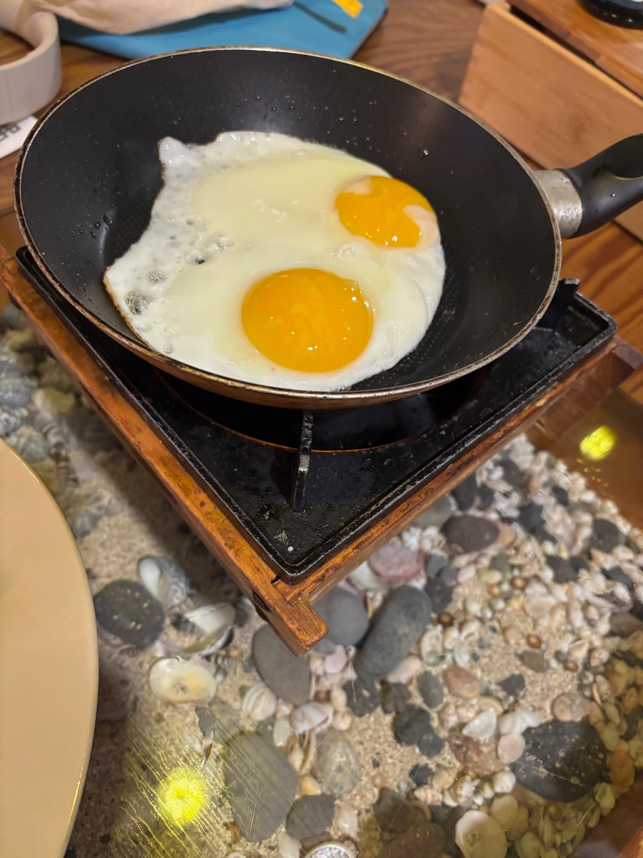 주문하면 기본찬을 차려주십니다. 밑반찬은 6가지로 구성되어 있고, 특이하게 불과 함께 미니프라이팬에 달걀후라이가 나옵니다. 아마도 인원수에 맞게 나오는 듯 합니다.
