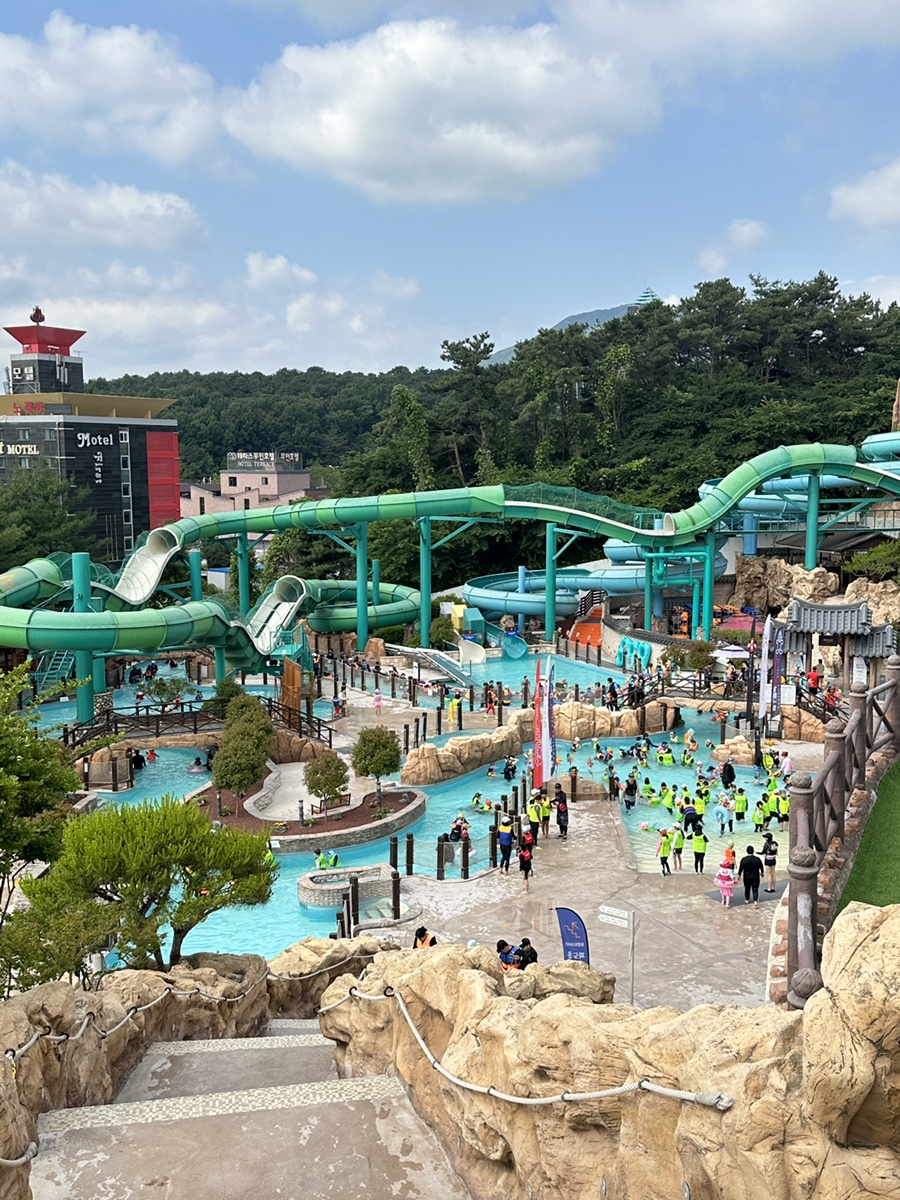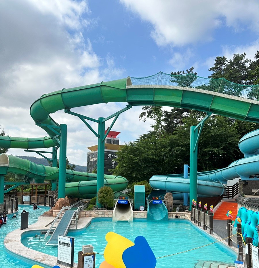 전날 지도로 본 워터파크의 규모는 상당히 커 보였습니다. 결론적으로 말하자면 워터파크의 규모는 그닥 크지 않았습니다. 크게 슬라이드 3개, 유수풀 1개, 키즈풀, 온천 바데풀 요정도입니다.