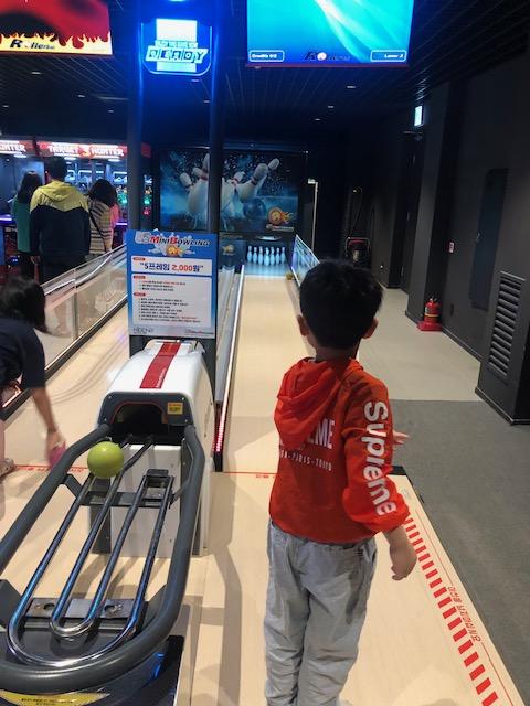 게임장에서 제일 인기있는 미니볼링장입니다. 볼링장이 있는 곳을 가면 아이가 아직 어려 볼링을 치고 싶지만 못 치는 경우가 많았었는데 저희 같은 어린 아이가 있는 가족에게 딱 안성맞춤인 게임입니다. 정말 잘 만들었다는 생각이 드네요! 아이가 너무나 재미있어 했습니다.
