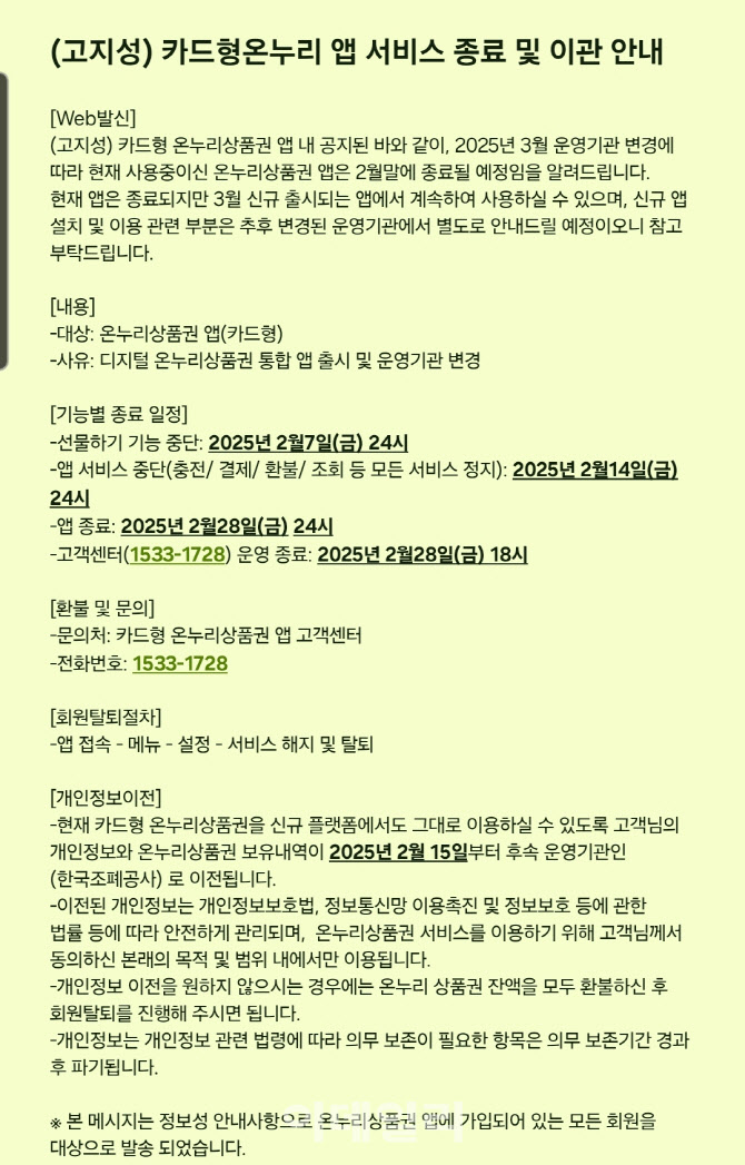 고지내용에 보시듯 선물하기, 충전하기, 사용하기 등 순차적으로 서비스가 중지될 예정이며, 회원탈퇴를 하지 않은 회원에 한해서 정보가 조폐공사로 모두 이전되어 사용할 수 있다는 내용입니다.