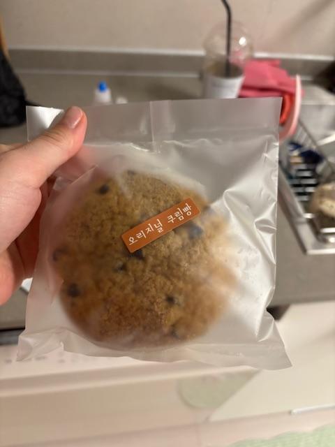이건 오리지널 쿠림빵과 겉모양은 비슷하게 생겼지만 쿠림빵이 아닌 번입니다. 안에 크림 대신 약간의 시나몬과 초코칩의 쿠키가 들어있어요~오리지널 쿠림빵도 그렇곡 이 쿠키번도 그렇고 시나몬 맛이 은은히 나서 더 맛있었던 것 같습니다~