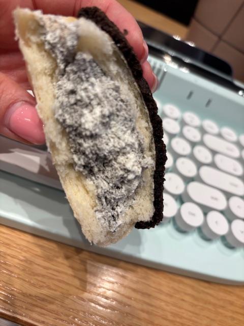 위에 초코 쿠키가 올라가 있고 안에는 오레오 크림이 들어있는 쿠림빵입니다. 오레오 맛에 초코쿠키라 살짝쿵 달았습니다. 요건 아메리카노와 함께 드시길 추천드립니다!