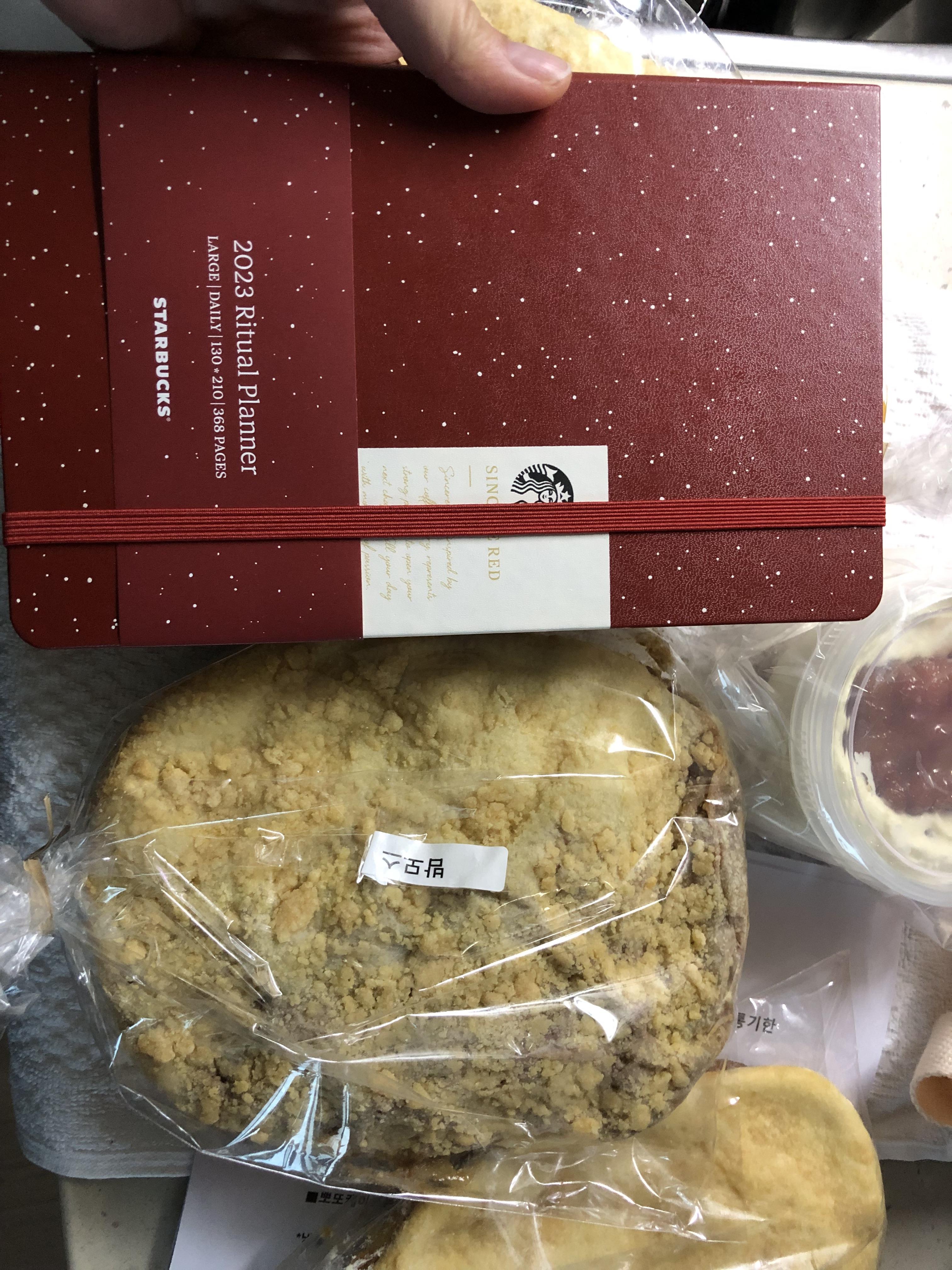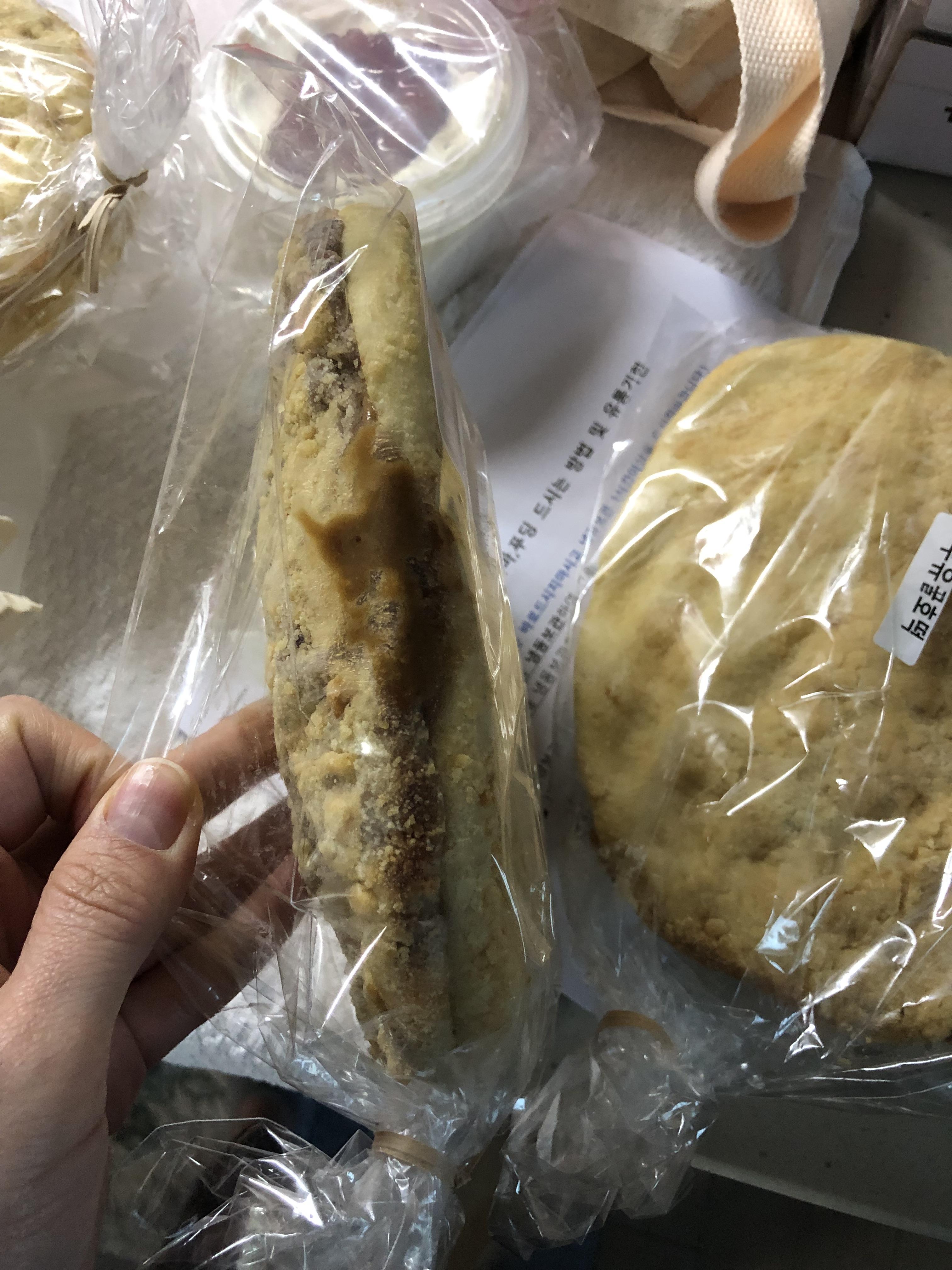택배로 시키니 맘모스가 조금 눌려서 오네요.. ^^;; 그런 점을 감안하더라도 킴앤콩쓰 맘모스는 요즘 유행하는 맘모스에 비해 두께가 얇은 편입니다. 크기도 스타벅스 다이어리보다 작습니다. 평범한 성인여성 손바닥보다 사알짝 큰 사이즈입니다.