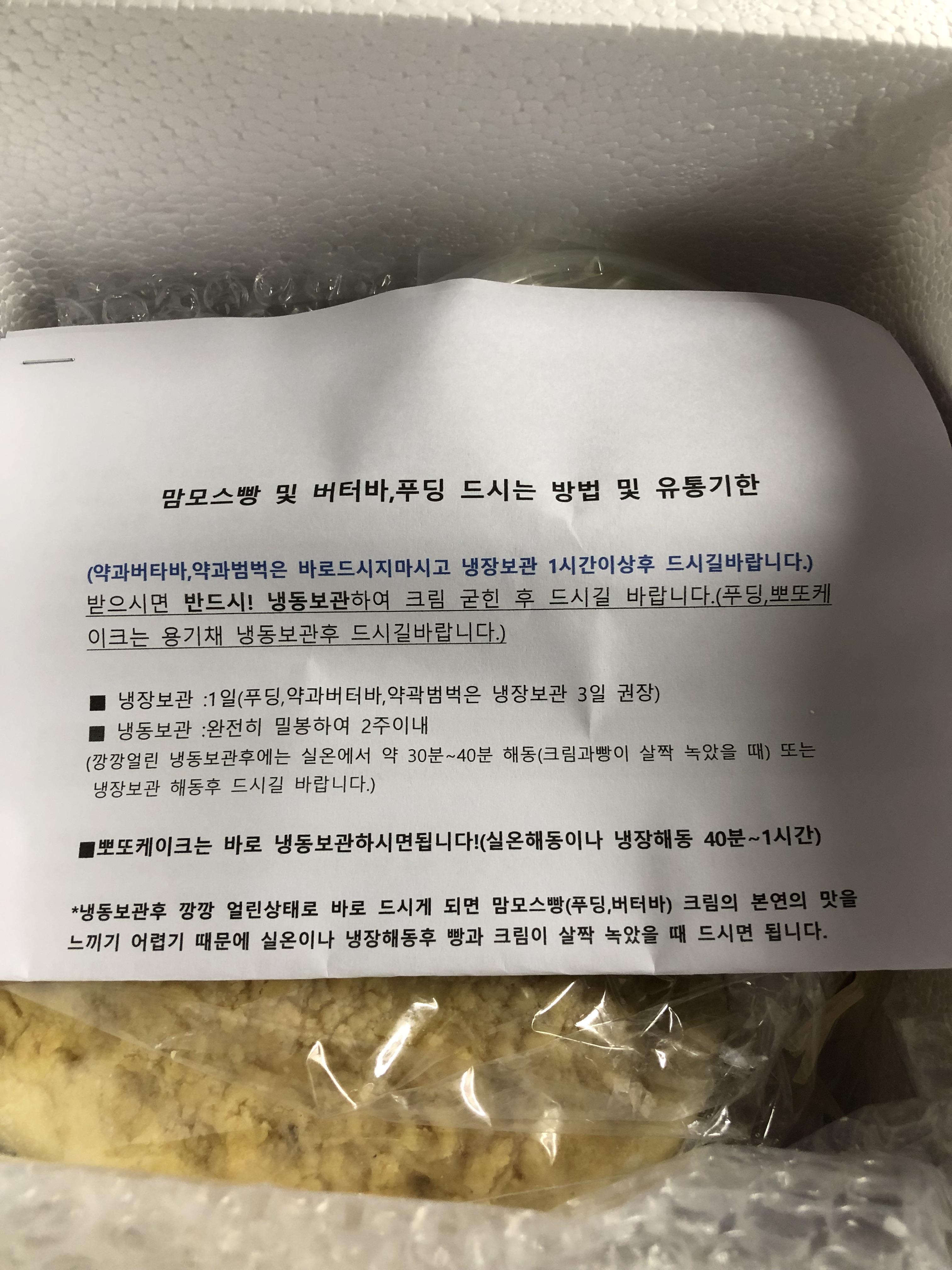 전 택배주문을 이용했습니다. 택배를 받으면 요렇게 보관 설명서를 같이 동봉해주십니다. 제가 이번에 주문한 맘모스는 '약과, 우유호떡, 밤모스'이며, 약과푸딩도 함께 주문했습니다.