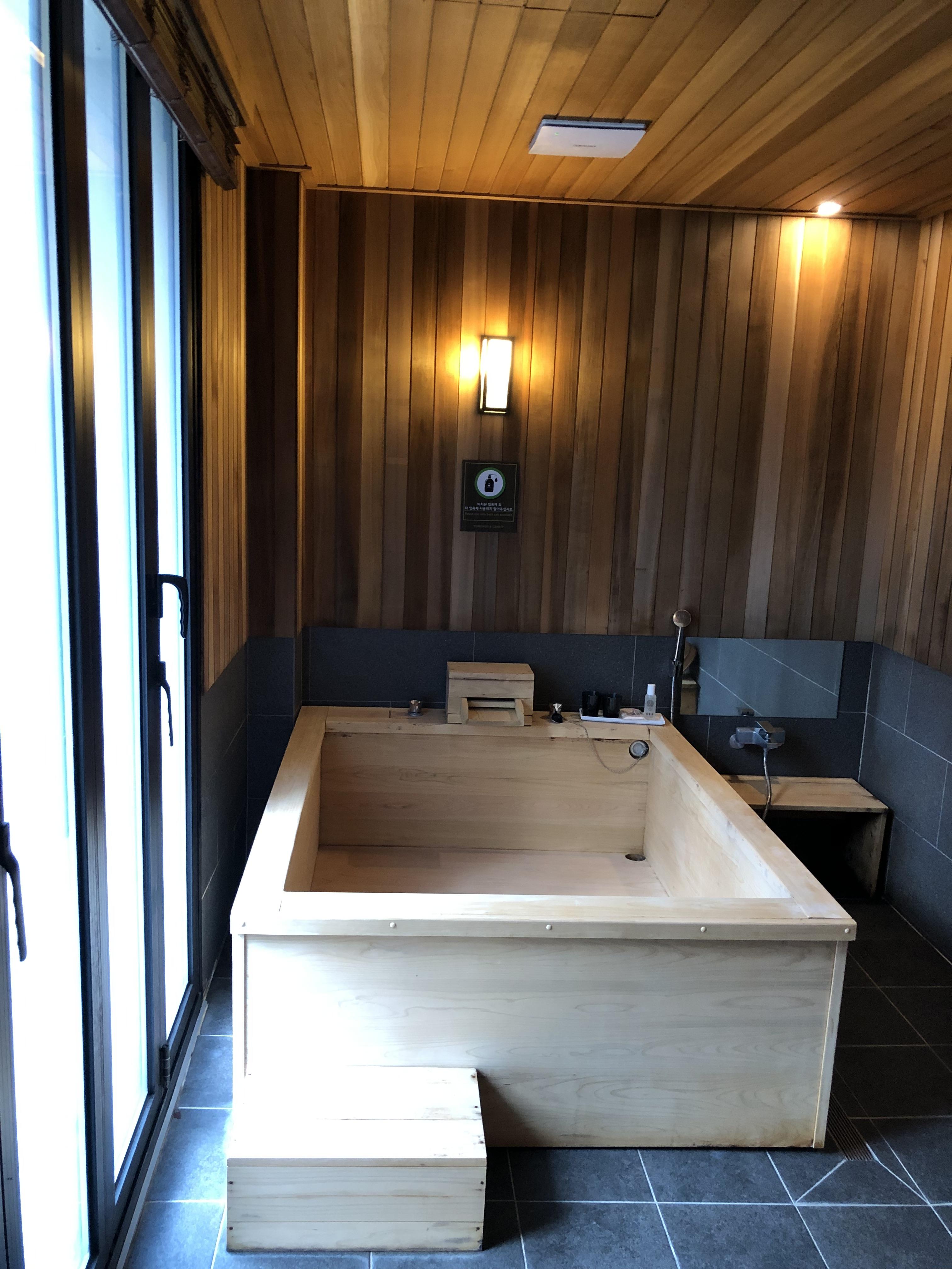 히노끼탕에 있는 창이 폴딩도어이고, 뒤가 산이기 때문에 폴딩도어를 열면 노천탕의 느낌을 받을 수 있습니다. 호텔 측에서 제공하는 핑크솔트 입욕제도 요긴하게 잘 썼습니다.