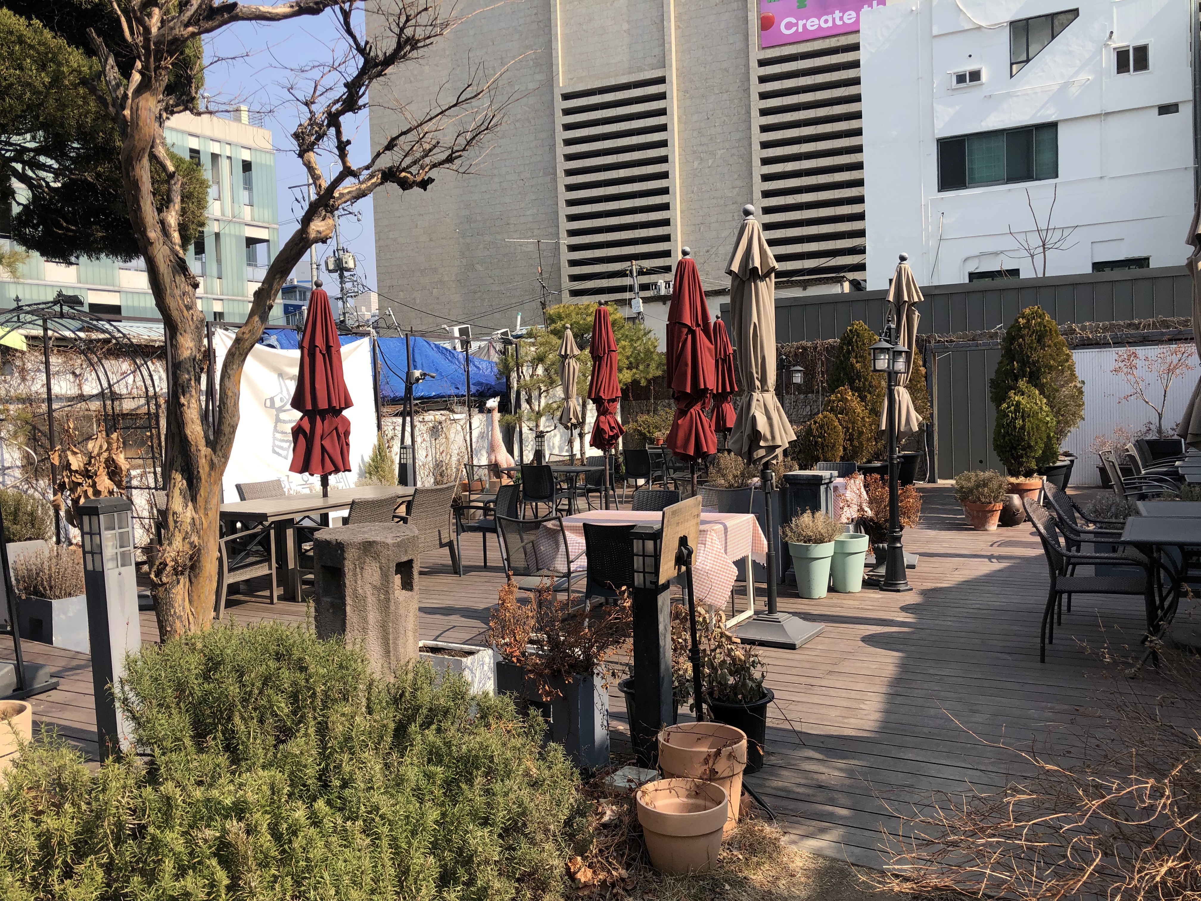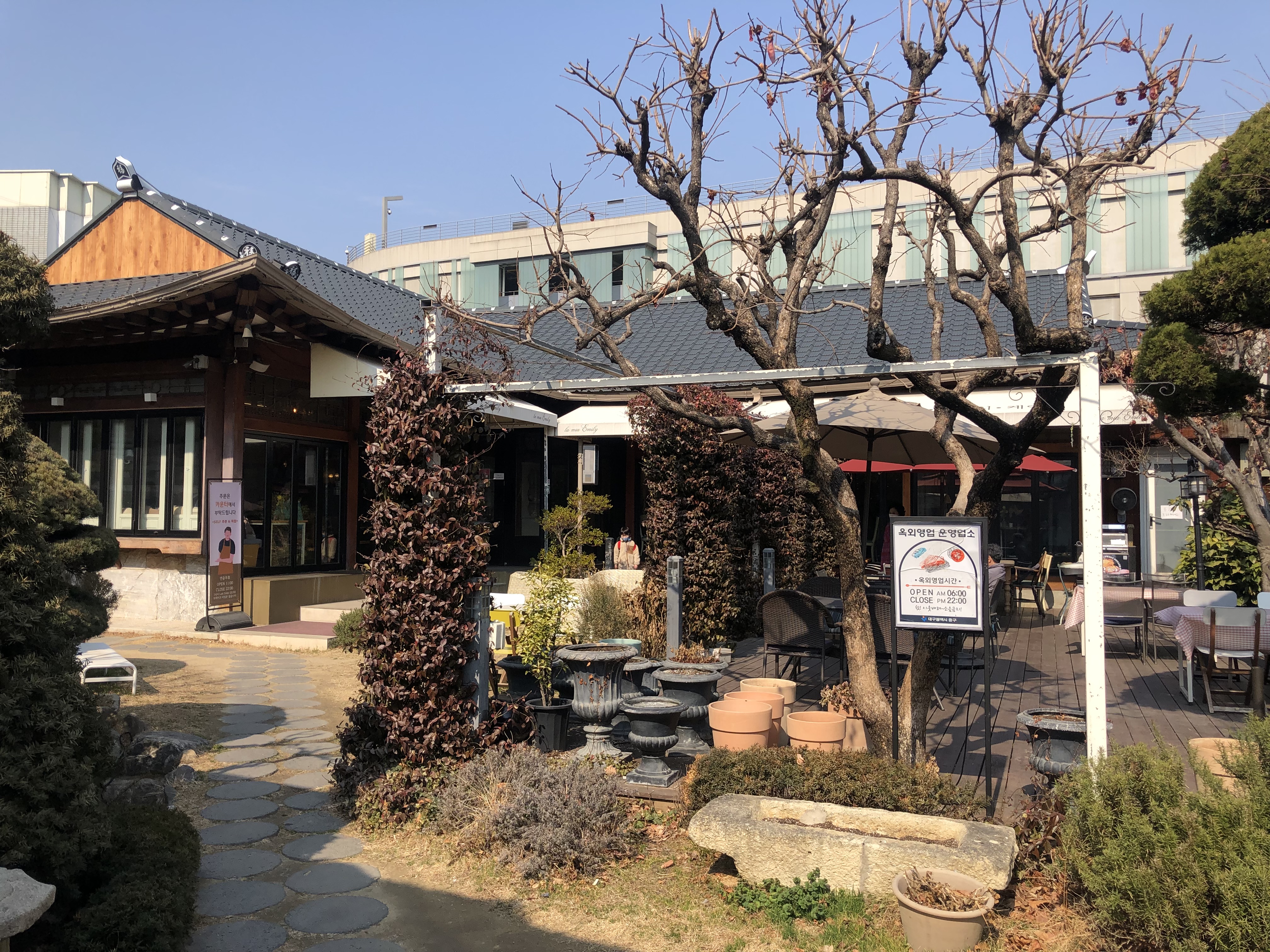 제가 방문한 때는 점심시간때 쯤이었는데요~ 아직 겨울이다 보니 마당이 조금 삭막한 느낌이 듭니다. 하지만 밤에 조명이 켜지면 더 로맨틱해진다고 하네요~