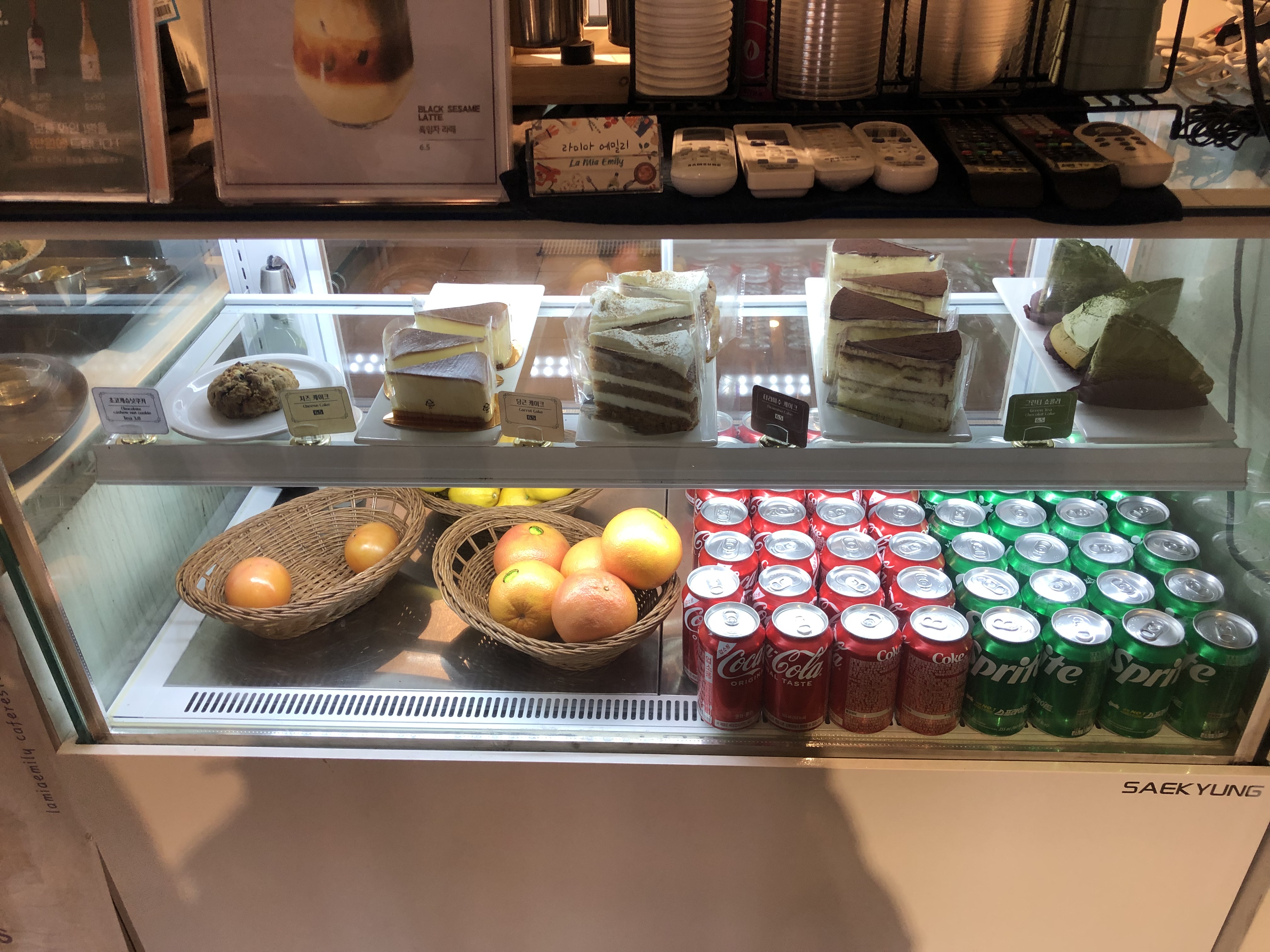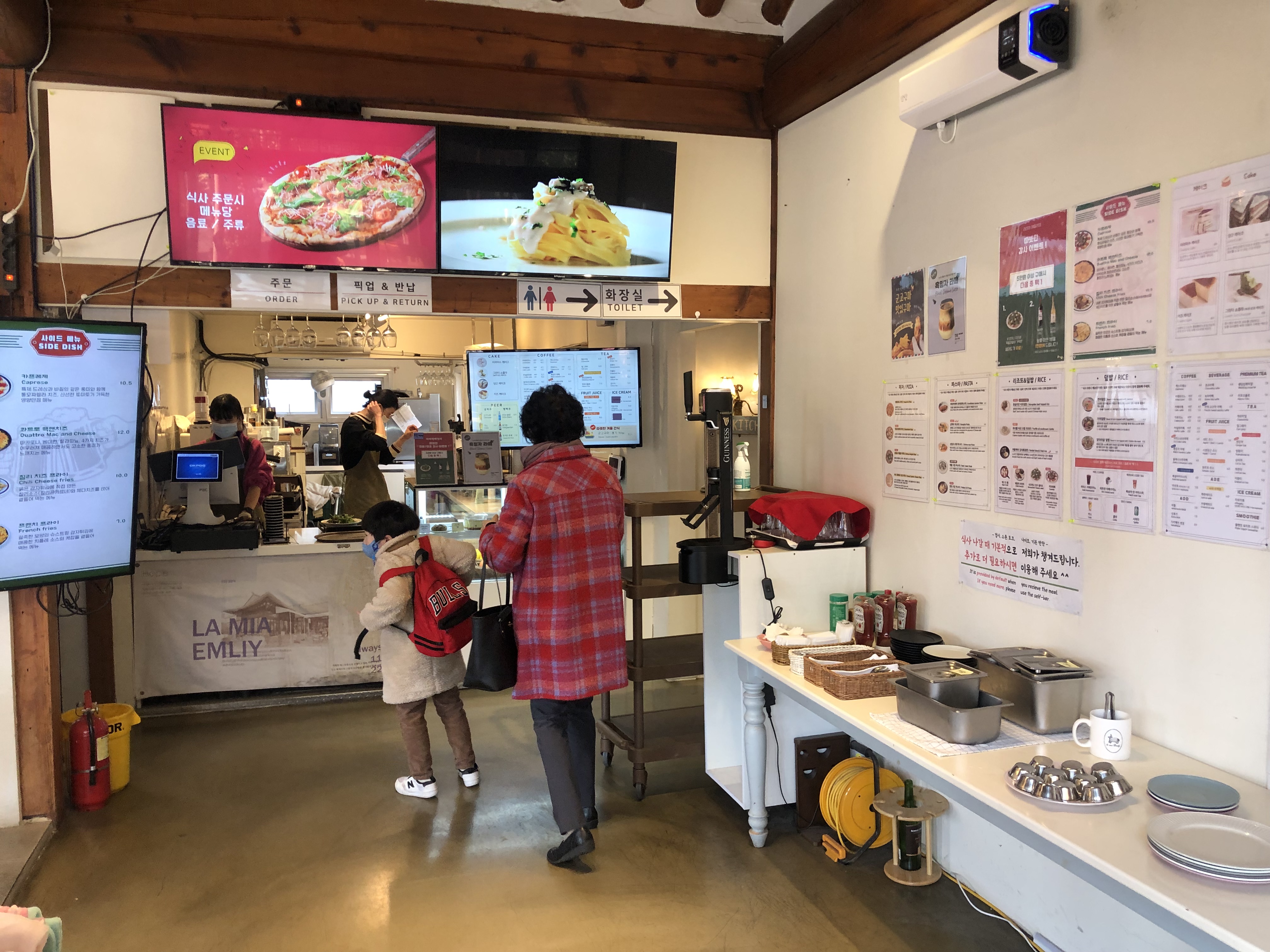 브런치 카페이다 보니 카운터 주위엔 셀프바가 있습니다. 쇼케이스엔 다양한 조각 케이크들도 보이네요~