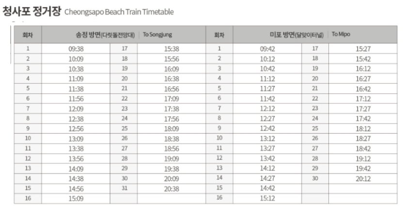 전 개인적으로 송정정거장에서 출발하시기를 권해드립니다. 대부분의 사람들이 미포정거장에서 출발하기 때문에 엄청 복잡하고 대기시간도 오래 걸립니다. 반면 송정정거장에서는 사람들이 훨씬 적어 대기시간도 그닥 오래 걸리지 않습니다. (실제로 전 송정정거장에서 입장하자마자 탑승하여 좌석에도 앉았습니다. 미포정거장에 도착하니 어마어마한 사람들이 대기줄에 서 계시더라구요...)