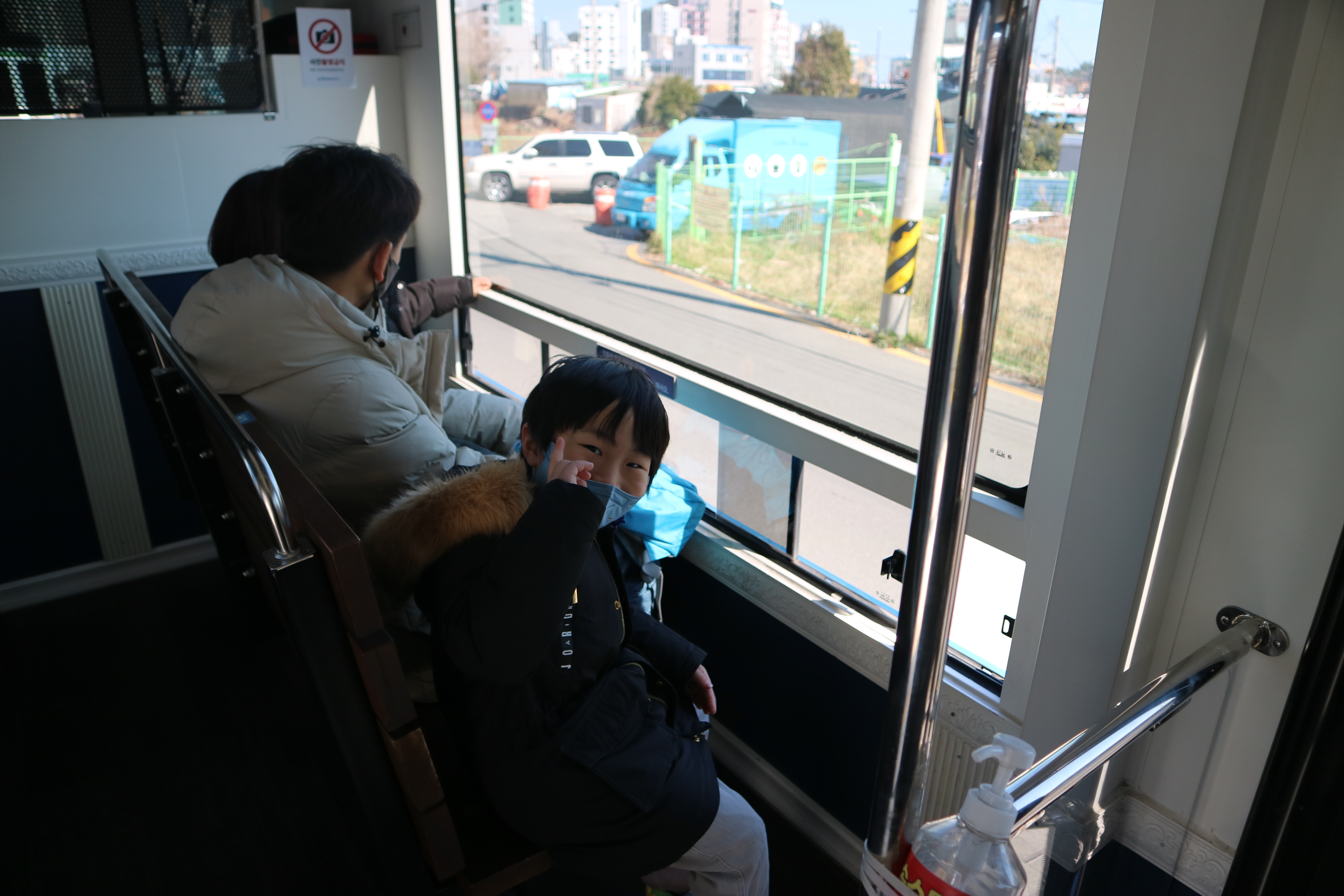 - 단체로 탑승하는 해변열차(지정좌석제 아님)