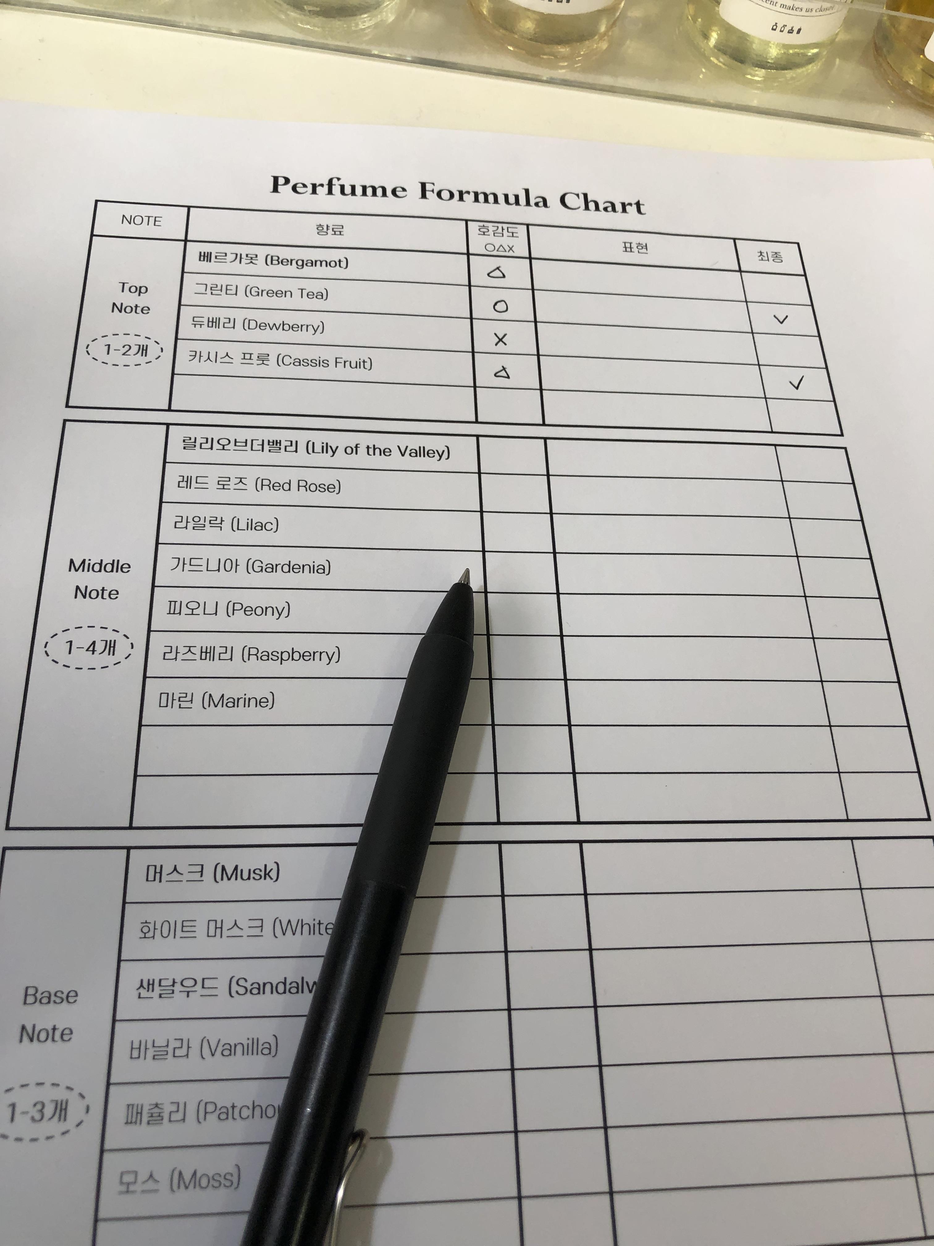전 향에 예민한 편이기 때문에 향수를 쓰지 않는데, 그걸 조향사님께서 바로 캐치를 하시더라구요. 그래서 차트에 미리 준비되어 있는 향 종류를 조금 변경하여 시향했습니다.