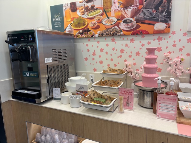 디저트 코너에는 머쉬멜로우, 비스켓, 딸기초코 폭포수 등이 있었고, 소프트 아이스크림 기계와 빙수 기계가 있습니다. 음료는 탄산과 자몽, 매실음료가 준비되어 있었습니다.