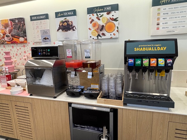 샤브올데이 서변연경점은 1층은 대기실, 2층은 식당으로 나뉘어져 있엇어요. 1층 대기실은 ㄱ자로 되어있는데, 2층으로 올라가는 계단이 있는 곳에 대기번호를 등록할 수 있는 기계가 있습니다. 대기가 있을 경우, 빠른 속도로 이 기계에서 대기 등록을 해주셔야 합니다. 또한 대기하면서 드실 수 있도록 음료와 물이 있는 바가 있으며, 아이들이 심심하지 않도록 뽑기 기계가 2대 있더라구요~