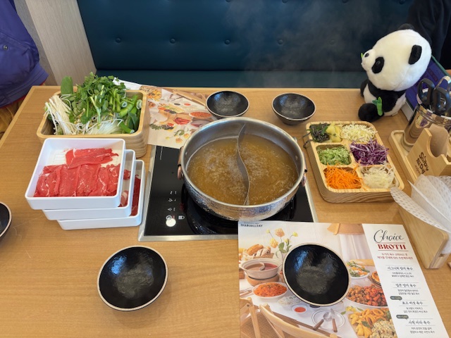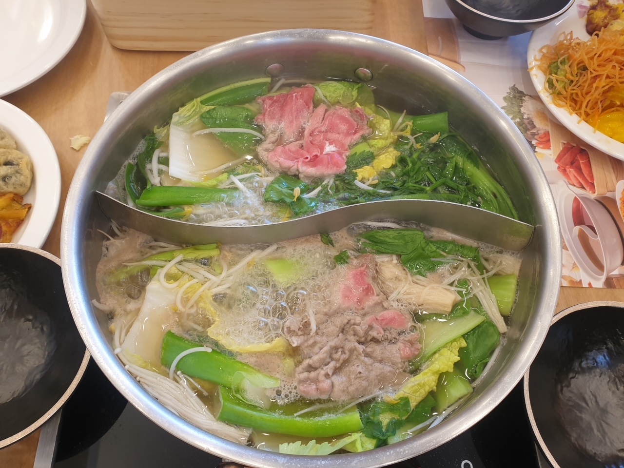 기본 냄비가 반반입니다. 저흰 아이가 있어서 두개 모두 맑은 육수를 넣었는데, 보통은 매운 맛과 맑은 육수로 드시겠죠?! ㅎㅎ