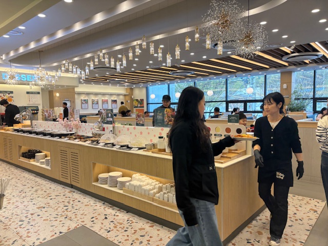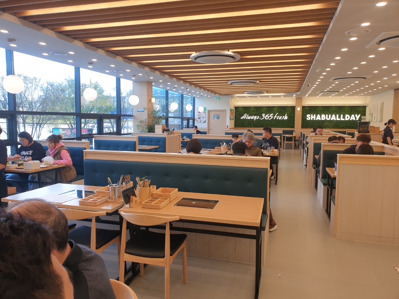 입구로 들어서자 마자 뷔페바가 있고, 샤브 재료들을 진열한 대형 냉장고가 있습니다. 홀은 군더더기 없이 깔끔했어요~ 애매한 시간이라 손님이 많지 않아 여유롭게 이용할 수 있었습니다.