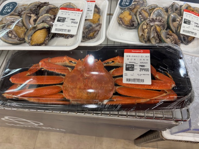 여러분! 행사가격 39,900원은 킬로당 가격이 아니라 한마리당 가격입니다. 때문에 직원분께 크고 묵직하고 살이 꽉찬 것으로 골라달라고 부탁했습죠~ 판매대에는 이미 쪄 놓은 대게를 한마리씩 포장해 놓은 상품도 있었어요.
